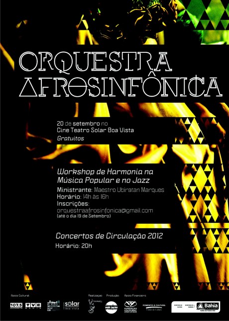 No dia 20 de setembro (quinta-feira), a Orquestra Afro Sinfônica se apresenta no Cine Teatro Solar Boa Vista, dentro do projeto de circulação em várias cidades baianas. Sob a regência do maestro Ubiratan Marques, a orquestra faz oito concertos na capital baiana e no interior, entre os meses de agosto e janeiro. A temporada é resultado de projeto aprovado pela Funceb através do edital de Demanda Espontânea de 2011, e todos os concertos têm entrada gratuita. A Orquestra apresentou-se em agosto em Ilhéus, abrindo a programação do evento Amar Amado. A natureza dos concertos da Orquestra Afro Sinfônica nesta temporada é didática, oferecendo ao público a oportunidade de interagir com a execução de músicas sinfônico-populares, utilizando linguagem acessível e atraente. A introdução com o concerto didático tem duração de meia hora, e o concerto do repertório de uma hora e vinte minutos. Como parte da programação da temporada, a Orquestra Afro Sinfônica promove workshops em diferentes áreas da música. Em setembro, o maestro Ubiratan Marques ministra o Workshop de Harmonia, também no dia 20 de setembro, das 14h às 16h, na sala de ensaio do Cine Teatro Solar Boa Vista. Com 40 vagas disponíveis, os alunos devem ter pelo menos 16 anos e saber ler partitura básica. Produzida pela Salamandra Produções, a temporada de circulação tem financiamento da Secretaria de Cultura, através da Demanda Espontânea do Fundo de Cultura da Bahia de 2011. Além de Salvador e Ilhéus, a Orquestra Afro Sinfônica passará também por Cachoeira, Jequié, Vitória da Conquista e Santo Amaro. SERVIÇO O QUE: Concerto Circulação Orquestra Afro Sinfônica QUANDO: 2º show da temporada: 20 de setembro de 2012 (quinta-feira), às 20h ONDE: Cine Teatro Solar Boa Vista (Parque Solar Boa Vista, s/nº, Engenho Velho de Brotas) QUANTO: gratuito Informações: (71) 8733-6661 | salamandraproducoes@gmail.com | ctsolarboavista@gmail.com O QUE: Workshop de Harmonia com maestro Ubiratan Marques QUANDO: 20 de setembro de 2012 (quarta-feira), das 14h às 16h ONDE: Sala de ensaio do Cine Teatro Solar Boa Vista (Parque Solar Boa Vista, s/nº, Engenho Velho de Brotas) Para alunos a partir dos 16 anos. Requisito: leitura de partitura básica. Inscrições gratuitas no local. Informações: (71) 8733-6661 | salamandraproducoes@gmail.comctsolarboavista@gmail.com