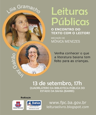 O projeto Leituras Públicas receberá nesta quinta-feira, dia 13, às 17h, no quadrilátero da Biblioteca Pública do Estado (Barris), as escritoras Iray Galrão e Lília Gramacho, que lerão trechos de suas obras. A mediação da mesa será feita pela escritora Mônica Menezes.