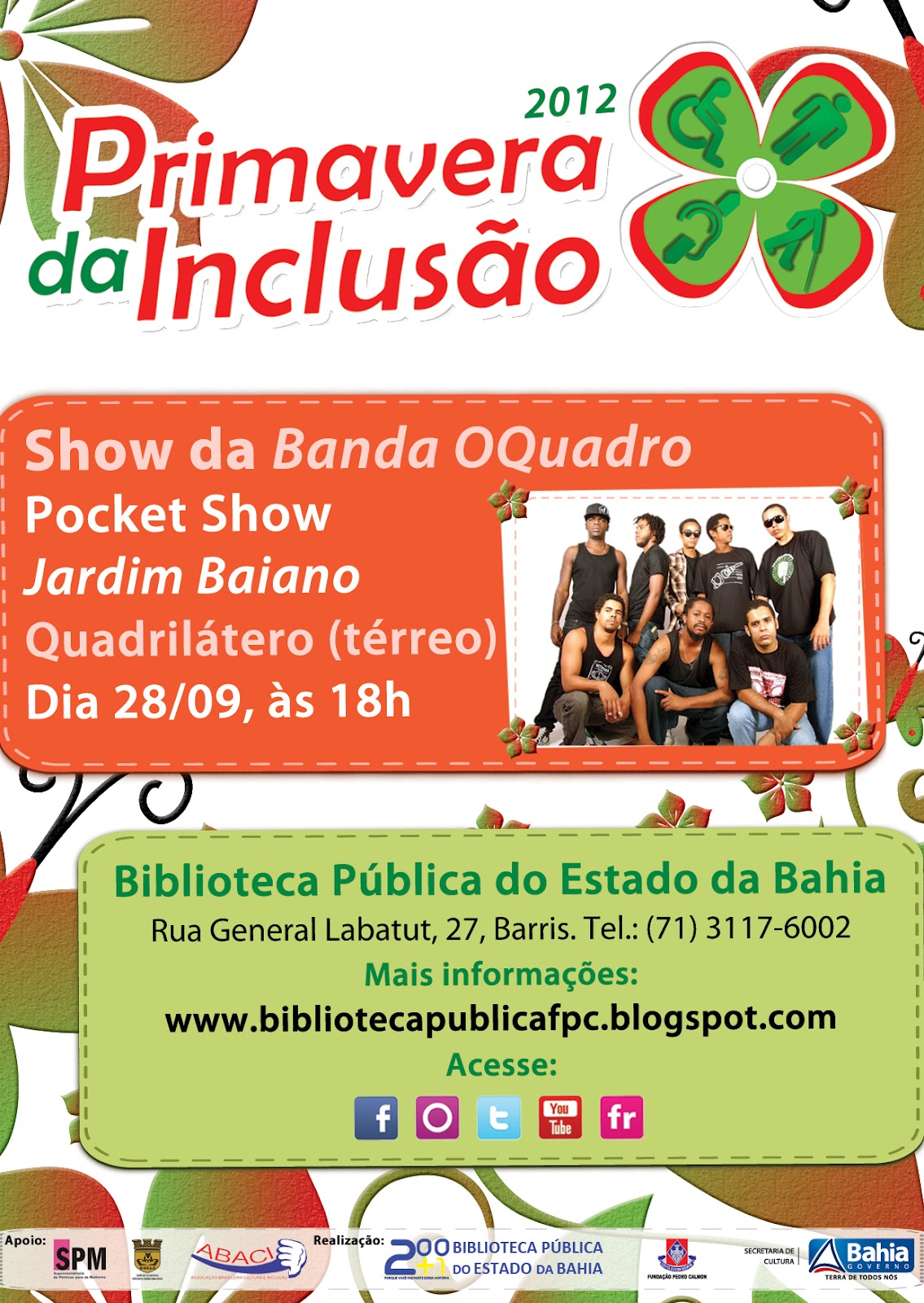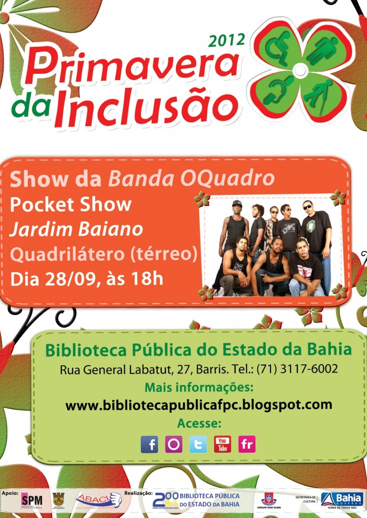 Na próxima sexta-feira (28), a partir das 18h, o Hip Hop e o samba invadem o Quadrilátero da Biblioteca no encerramento das atividades em comemoração ao mês da Luta da Pessoa com Deficiência e à chegada da estação das flores. É o projeto "Primavera da Inclusão 2012", que apresenta em sua programação musical o show da conceituada banda OQuadro. Pra começar, um pocket show de samba com a banda Jardim Baiano.