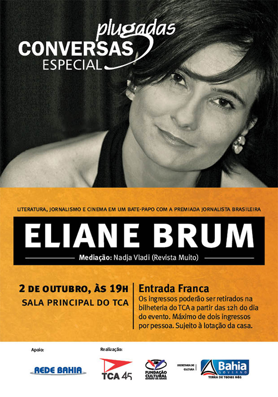 Conversas Plugadas Especial traz a Salvador, para o palco principal do Teatro Castro Alves, a mistura de literatura, jornalismo e cinema, em um bate-papo com a jornalista Eliane Brum. O evento, uma realização da Coordenação de Literatura da Fundação Cultural do Estado da Bahia (FUNCEB), unidade da Secretaria de Cultura do Estado da Bahia (SecultBA) e o TCA, acontece no dia 02 de outubro, às 19h. A entrada é gratuita e os ingressos poderão ser retirados na bilheteria do TCA a partir das 12h do dia do evento, com o limite de dois ingressos por pessoa.