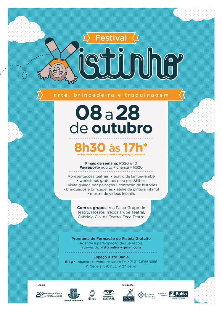 O mês dedicado às crianças não passará em branco no Espaço Xisto Bahia, Secretaria de Cultura do Estado da Bahia – Secult/BA. Entre os dias 08 e 28 de outubro, o Festival Xistinho – Arte, Brincadeira e Traquinagemrealizará atividades recreativas com teatro de lambe-lambe, brincadeiras tradicionais, brincadeiras de circo, contação de história, mostra de vídeos, visita guiada com palhaços e muito mais. A iniciativa, idealizada pelo Espaço Xisto Bahia, em parceria com a Biblioteca Pública do Estado, Diretoria de Audiovisual (DIMAS), escolas da rede pública de Salvador, artistas e produtores locais, tem como objetivo ampliar a frequência do público infanto-juvenil através das atividades, despertando assim o interesse na linguagem teatral. De acordo com a programação, as oficinas de sensibilização teatral irão acontecer as segundas, terças e quartas feiras, nas escolas da rede municipal de ensino. Já os sábados e domingos, a criançada poderá participar de brincadeiras diversas, além de oficinas para pais e filhos, a partir das 08h30, no Espaço Xisto. Ateliê de pintura infantil, contação de história e oficinas circenses completam a programação. O Festival conta ainda com apresentações dos espetáculos teatrais: “Vira Lona, Lona Vira”, “Meia Dúzia de Pepinos”, “Fábulas Fabulosas” e “De Sol, de Céu, de Lua”. As apresentações acontecem no Espaço Xisto Bahia, às quintas e sextas feiras, especialmente para o público das instituições de ensino público inscritas no Programa de Formação de Plateia Gratuito (com exceção do espetáculo “De Sol, de Céu, de Lua”). Aos sábados e domingos, os espetáculos são abertos ao público em geral, sempre às 11h e 16h. Os ingressos nesse caso dão direito a todas as atividades e custam R$20 (inteira) e R$10 (meia), e o passaporte (adulto + criança) R$20.