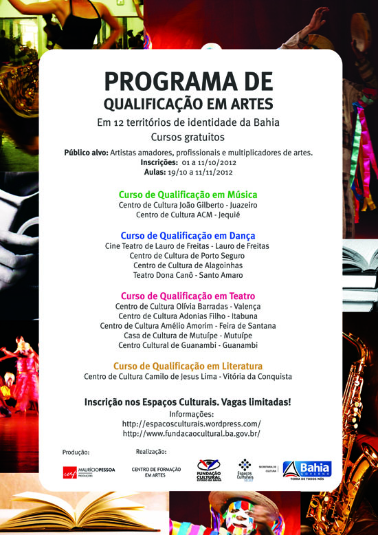 A Superintendência de Desenvolvimento Territorial da Cultura (Sudecult) da Secretaria de Cultura do Governo do Estado da Bahia (SecultBA), através da sua Diretoria de Espaços Culturais, em parceria com o Centro de Formação em Artes (CFA) da Fundação Cultural do Estado da Bahia (FUNCEB), abre inscrições para uma série de cursos gratuitos de qualificação profissional em artes em 12 municípios do interior baiano. Serão oferecidas aulas nas áreas de teatro, dança, música e literatura, com o objetivo de promover qualificação e atualização de artistas, amadores ou profissionais, que atuam em Alagoinhas, Feira de Santana, Guanambi, Itabuna, Jequié, Juazeiro, Lauro de Freitas, Mutuípe, Porto Seguro, Santo Amaro, Valença e Vitória da Conquista. Os interessados devem se apresentar nos espaços culturais da SecultBA localizados nas cidades listadas, até o dia 11 de outubro. As aulas têm início em 19 de outubro e seguem até 11 de novembro. Os cursos possuem carga horária de 60 horas, divididos em cinco módulos de 12 horas cada. Os seus resultados deverão contribuir para uma maior inserção dos artistas no campo das artes e da cultura, e, consequentemente, para um aumento da capacidade produtiva nos diversos Territórios de Identidade da Bahia, ampliando as possibilidades de trabalho e renda para estes profissionais. Os alunos que tiverem pelo menos 75% de frequência receberão certificado reconhecido pelo Ministério da Educação (MEC), emitidos pelo CFA. A FUNCEB, através do CFA, vem desenvolvendo ações para garantir o acesso democrático da comunidade ao fazer artístico-educativo, direcionado à qualificação de artistas, grupos independentes e produtores culturais, na perspectiva da revisão dos conhecimentos, a partir de parâmetros contemporâneos. CURSOS DE QUALIFICAÇÃO PROFISSIONAL EM ARTES Curso de Qualificação em Música- Centro de Cultura João Gilberto - Juazeiro