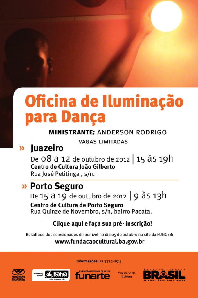 A Fundação Cultural do Estado da Bahia (FUNCEB), entidade vinculada à Secretaria de Cultura do Estado (SecultBA), inscreve até o dia 05 de outubro de 2012 para a Oficina de Iluminação para Dança nos municípios de Juazeiro e Porto Seguro. A oficina é uma ação da Coordenação de Dança da FUNCEB que visa capacitar os profissionais da linguagem na área de iluminação. A inscrição é gratuita.