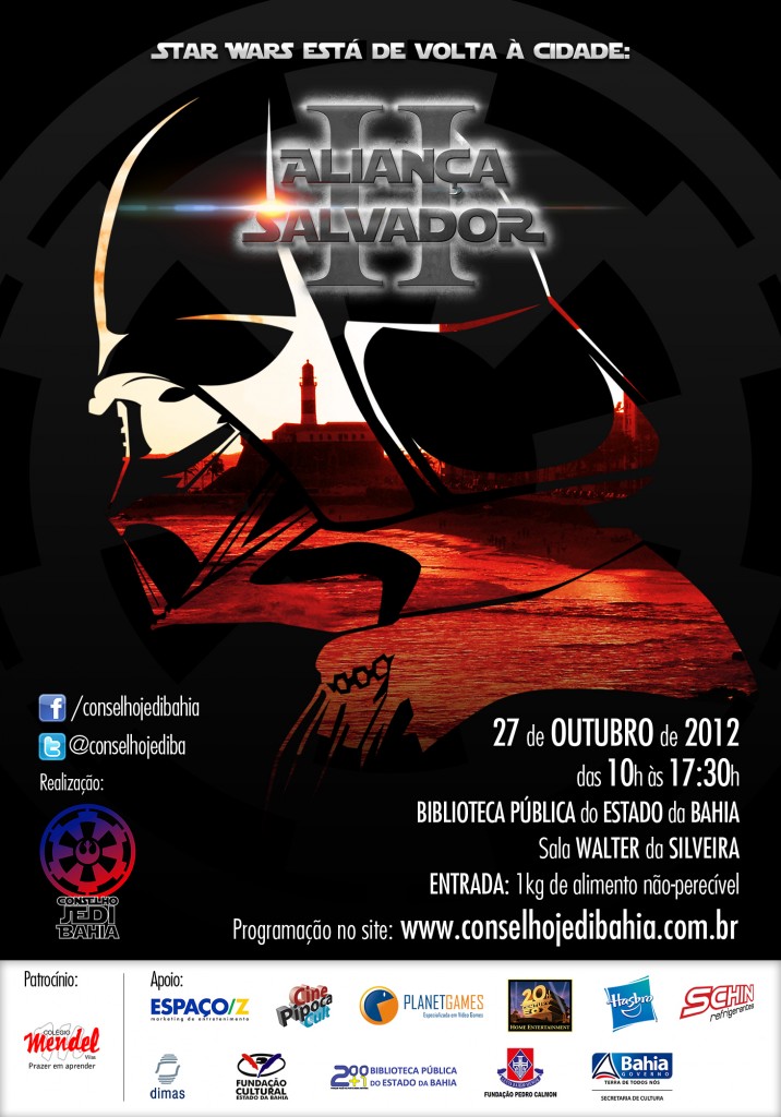 A galáxia de Star Wars está de volta à cidade. O fã-clube baiano “Conselho Jedi Bahia” promove a segunda edição do seu maior evento, a “Aliança Salvador”. Serão realizadas atividades e atrações sob a temática da saga intergaláctica no dia 27/10 (sábado), a partir das 10h, na Biblioteca Pública do Estado da Bahia (Fundação Pedro Calmon) e na Sala Walter da Silveira (DIMAS/FUNCEB).