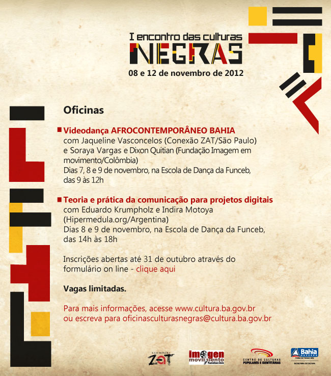 Interessados em participar  das oficinas "Teoria e prática da comunicação para projetos digitais" e "Videodança Afrocontemporâneo Bahia", do I Encontro das Culturas Negras, tem até o próximo dia 31 de outubro para efetuar inscrições. O evento, que acontece nos dias 08 e 12 de novembro de 2012, em Salvador e Santo Amaro, abrange diversas apresentações artístico-culturais, debates e discussões com pesquisadores, intelectuais, artistas e representantes do movimento negro. As oficinas, com 25 vagas cada, serão realizadas na Escola de Dança da Fundação Cultural do Estado da Bahia (FUNCEB), em Salvador, entre os dias 7 e 9 de novembro, das 9 às 12h e das 14 às 16h. Para realizar sua inscrição acesse: https://docs.google.com/spreadsheet/viewform?formkey=dGxuallUTnY1TUZRQjRNZkpDYkdqNGc6MQ#gid=0 Programação Oficinas: Oficinas 1 . Teoria e prática da comunicação para projetos digitais Cultura, comunicação e novas mídias  -  construção de uma proposta de uma  comunicação Ministrantes: Eduardo Krumpholz e Indira Montoya (Hipermedula.org/Argentina) Data: 08 e 09 de novembro das 14h às 18h Local: Escola de Dança da Funceb/Centro de Formação em Artes 2 .Oficina de vídeodança AFROCONTEMPORÂNEO BAHIA Ministrantes: Jaqueline Vasconcelos (Conexão ZAT/São Paulo) e Soraya Vargas e Dixon Quitian                   (Fundação Imagem em Movimento/Colômbia) Data: 07, 08 e 09 de novembro das 9h às 12h Local: Escola de Dança da Funceb/Centro de Formação em Artes