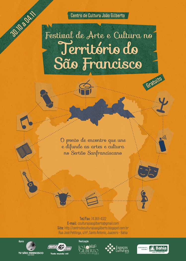 A Secretaria de Cultura do Estado da Bahia (Secult/BA) promove, de 30 de outubro a 4 de novembro, em Juazeiro, o Festival de Arte e Cultura no Território do São Francisco. Realizado pelo Centro de Cultura João Gilberto, durante os cinco dias de festival, a população poderá conferir uma série de atividades artístico-culturais e de formação - shows com artista e grupos da região, mesa redonda, exibição de filmes, exposições, feiras literárias, Hip Hop, skatistas, grafitagem, entre outros. O evento tem como objetivo celebrar, difundir e criar meios para o diálogo entre os municípios que integram a região do território do São Francisco. “O festival é um bom momento para reconhecermos o diversificado potencial artístico da região, além de ser um espaço para o diálogo e a convergência cultural”, afirma João Leopoldo Vargas, diretor do Centro de Cultura João Gilberto. Programação: 30 de outubro a 03 de novembro 14h às 18h - Oficina de Máscaras Africanas – Alda Moreira 15h às 19h - Oficina de Acrobacia em Tecido - Steban A. Costa 17h às 21h - Oficina de Literatura de Cordel – Valdir Lemos 18h às 22h - Oficina de Iniciação Teatral – Francisco Fernandes Senna Neto (Devilles) 01 de novembro 19h – Roda de Conversa: “A Cultura no Território do São Francisco” Convidados – Profª Maria Isabel Pontes, Profº Euriclésio Sodré, Profº Parlim, Profº Moises Almeida, Hertz Felix (ator e cineasta), Roberto Filho (cineasta), Flavio Henrique (cineasta e roteirista do filme “Nego D’agua”), Pompilio Dourado (historiador) e Chico Egidio (produtor do Projeto Vale Curtas). Mediador – Lariane Rocha 02 de novembro Local: Ilha do Rodeadouro 17h - Apresentação de Samba de Veio - D. Ovídia e Maria Perpetua 18h – Exibição dos documentários: “Juazeiro Ontem”, “Historia de Remanso” e “Pau de Colher e Canudos”. 03 de novembro 15h - Sarau das Culturas Populares do Território – apresentações de Repentistas, Aboiadores, Congos, Roda de São Gonçalo e Corrida de Argolinhas (Juazeiro); Banda de Pífanos (Uauá); Coral G-DECC do Ponto de Cultura Transformart e Orquestra de Câmara de Curaça (Curaçá); Quadrilha Junina (Casa Nova). 17h – Feira das Culturas Populares 22h – Shows - Silas do Acordeon e Neto e Mundinho 04 de novembro 17h – Feira das Culturas Populares 18h - Celebração Musical das Artes do Território - Hip Hop, skatistas, malabaristas, performistas e grafitagem 20h - Shows - Bandas Apocalipse Reggae e Rock Andranjos