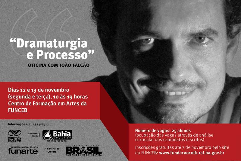 A Fundação Cultural do Estado da Bahia (FUNCEB), unidade da Secretaria de Cultura do Estado (SecultBA), em parceria com a Fundação Nacional de Artes (Funarte), vinculada ao Ministério da Cultura (MinC), inscreve até o próximo dia 7 de novembro para a oficina Dramaturgia e Processo, que será conduzida pelo diretor, roteirista, dramaturgo e compositor João Falcão. As aulas vão acontecer no Centro de Formação em Artes da FUNCEB (CFA), nos dias 12 e 13 de novembro, das 10 às 19 horas. As inscrições são gratuitas e devem ser feitas através do formulário disponível no site da FUNCEB: www.funceb.ba.gov.br. São disponibilizadas 25 vagas, destinadas a estudantes e profissionais da dramaturgia e do teatro baiano, e, havendo número excedente de inscritos, será feita análise curricular para ocupação das mesmas. Trabalhando processos criativos em exercícios de dramaturgia, os alunos poderão ter contato com o repertório de conhecimentos e experiências do artista ministrante: João Falcão escreve, compõe e dirige para teatro, televisão e cinema e é um dos diretores e dramaturgos mais presentes e premiados no cenário nacional. Sua parceria com Guel Arraes na TV Globo produziu séries como Brasil Especial, A Comédia da Vida Privada e O Auto da Compadecida, da qual também assinou a trilha sonora. Ainda para a Rede Globo, escreveu episódios de séries como Os Normais e Ó Pai, Ó. Criou e dirigiu programas como Clandestinos, Sexo Frágil e sitcom.br. Atualmente, escreve o Louco por Elas, da mesma emissora. Na experiência no teatro, podem-se citar A Dona da História, que escreveu, dirigiu e musicou especialmente para Marieta Severo e Andréa Beltrão, e que depois virou filme de Daniel Filho, cujo roteiro foi também assinado por Falcão. Outros trabalhos englobam a direção do espetáculoQuem Tem Medo de Virginia Wolff, com Marco Nanini, Marieta Severo, Sílvia Buarque e Fábio Assunção; texto e direção do musical Cambaio, numa parceria com Chico Buarque, Edu Lobo e Adriana Falcão; e adaptação e direção do espetáculo O Pequeno Príncipe, com Luana Piovani. A oficina Dramaturgia e Processo faz parte do programa da Coordenação de Teatro da FUNCEB e se apresenta como o primeiro curso desta linguagem a ser realizado no Centro de Formação em Artes da instituição, que já vem oferecendo atividades de formação e qualificação em Artes Visuais, Dança e Música em suas dependências. Oficina Dramaturgia e Processo com João Falcão Inscrições: Até 7 de novembro de 2012 em www.fundacaocultural.ba.gov.br Aulas: 12 e 13 de novembro de 2012 (segunda e terça), de 10 às 19 horas Local: Centro de Formação em Artes da FUNCEB (Rua do Bispo, nº 29/31 – Pelourinho. Salvador/BA) Quanto: Grátis Mais informações: 71 3324-8522/8525 Realização: FUNCEB/ SecultBA/ Funarte/ MinC