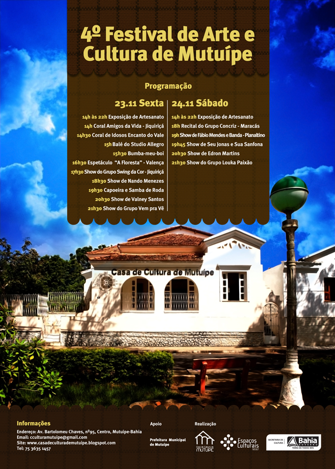 A Secretaria de Cultura do Estado da Bahia – Secult/BA, através da Casa de Cultura de Mutuípe realiza o IV Festival de Arte e Cultura de Mutuípe. Todas as tardes, dos dias 23 e 24 de novembro, o espaço recebe atividades diversas no campo da música, dança, teatro e culturas populares. Diversos grupos de Mutuípe e outras cidades do Território de Identidade se apresentam, sempre com entrada gratuita. A realização do Festival é importante para a valorização, divulgação e incentivo da arte e cultura no Território, dos seus artistas, além de proporcionar ao espaço dinamização de suas ações. Nas edições anteriores foi grande a interação e adesão do público. Mais de duas mil pessoas já compareceram nos anos de 2009, 2010 e 2011, e ao todo foram mais de 40 artistas envolvidos nas diversas linguagens. Neste ano, a programação tem início com Exposição de Trabalhos Artesanais, às 14h. No decorrer dos dias 23 e 24, acontecem apresentações de Corais, espetáculos teatrais, espetáculos de balé, rodas de samba e capoeira. Shows dos cantores Nando Menezes, Valney Santos, Edron Martins e dos grupos Swing da Cor, Vem pra Vê, entre outros, também entram no programa. O encerramento fica por conta da apresentação musical da banda Louka Paixão, às 21h.