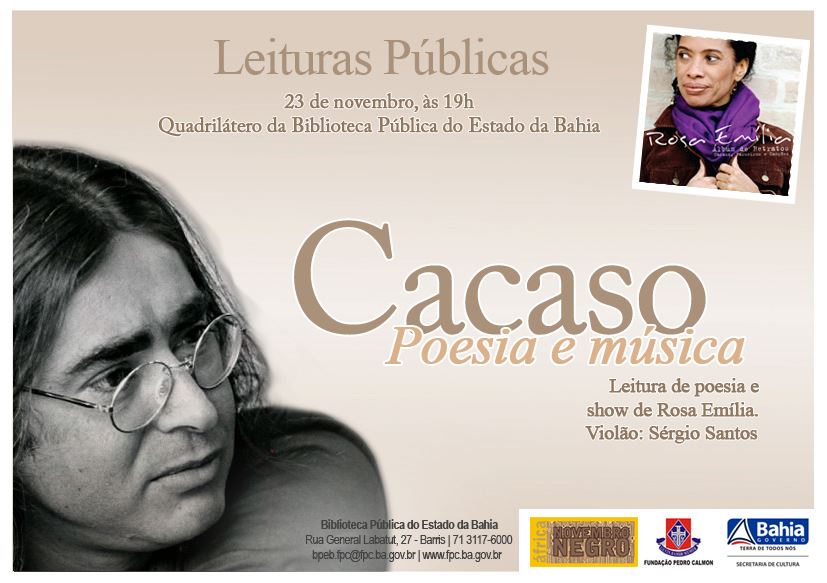 O poeta também foi um dos mais notáveis letristas da Música Popular Brasileira, tendo escrito composições como Lero-lero, Face a Face, Dentro de mim mora um anjo, dentre outras. Entre seus parceiros musicais, Toquinho, Tom Jobim, Jards Macalé, Edu Lobo, Francis Hime, Sivuca, João Donato, Danilo Caymmi e João Bosco. Em seu show, Rosa Emília, última companheira de Cacaso, falecido em 1987, contará com a participação do mineiro Sérgio Santos no violão. Ela interpretará algumas composições do poeta, em parceria com renomados compositores da MPB, e também dos seus cinco discos. Rosa mora na Itália desde 1989, onde já trabalhou com artistas como Fabrizio de André, Renato Sellani, Cristiano Verardo, Carlo Fava, Silvio Damico, Massimo Morricone, entre outros. No momento, lança seu mais novo CD "Álbum de Retratos – Cacaso, Parceiros e Canções". O disco conta com as participações especiais de Joyce, Sueli Costa, Nelson Ângelo, Sérgio Santos, Zé Renato, Olívia Byington, Nando Carneiro e Filó Machado, todos parceiros de Cacaso. As "Leituras Públicas" são uma iniciativa da Diretoria do Livro e da Leitura - DLL, da Fundação Pedro Calmon/SecultBA. O mesmo segue até o mês de março de 2013, com datas, autores e mediadores já definidos. A entrada é gratuita. O projeto acontece uma vez por mês, apresentando sempre um ou mais autores que leem trechos de suas obras. Quando: dia 23/11 (sexta-feira), às 19hOnde: Quadrilátero (térreo)Quanto: Gratuito