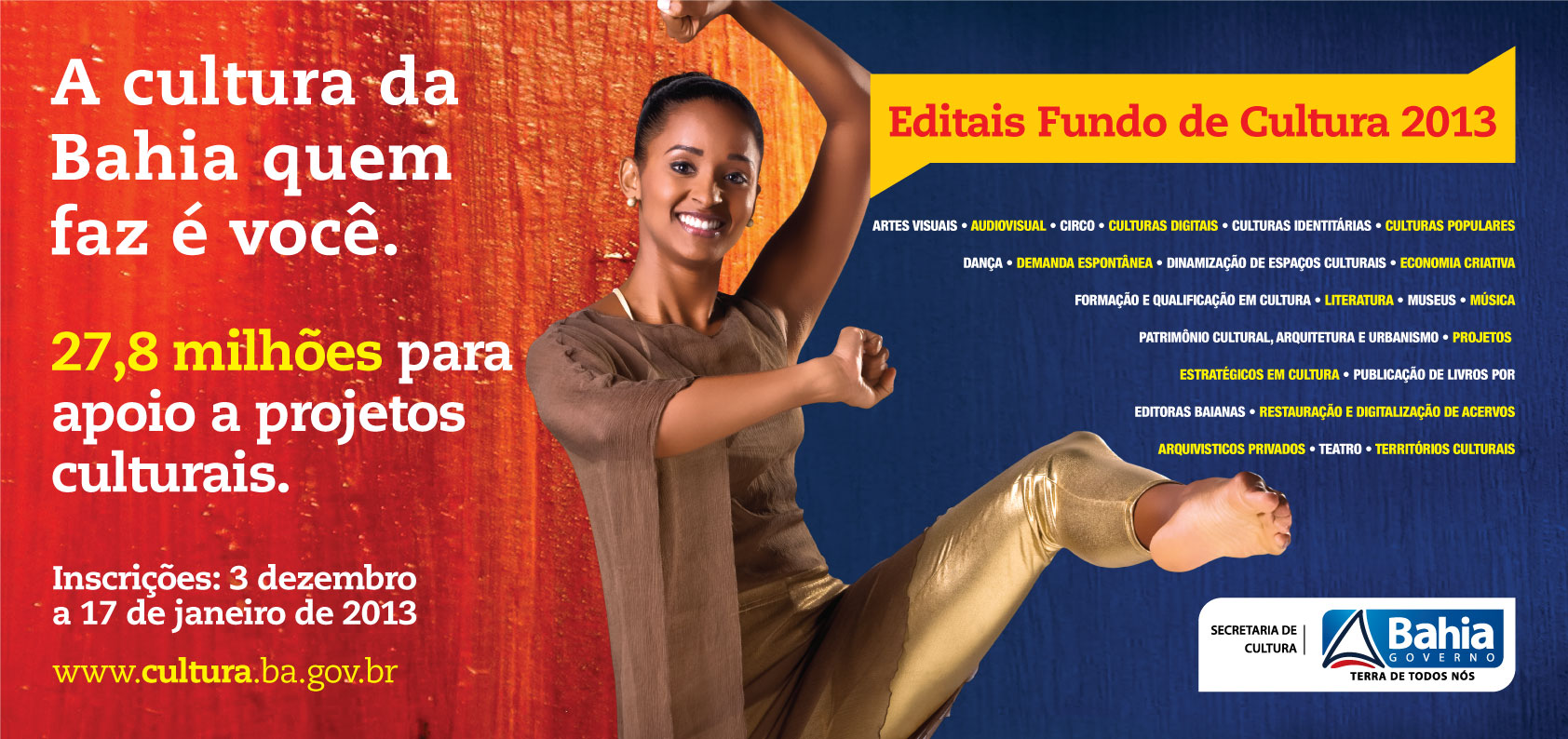 Com o intuito de manter uma sistemática de apoio a projetos culturais da sociedade civil e possibilitar cada vez mais a organização da produção cultural em nosso estado, a Secretaria de Cultura do Estado da Bahia (SecultBA) abre, mais uma vez neste mesmo ano, as inscrições para os editais do Fundo de Cultura da Bahia (FCBA). De 03 de dezembro até 17 de janeiro de 2013 estão abertas as inscrições para 19 Editais Setoriais (dois deles, inéditos) e para Demanda Espontânea, com investimento global de 27,8 milhões – o que representa um aumento de 52% do recurso em relação à última seleção, realizada entre maio e julho deste ano. “Abrir os editais agora, em dezembro, é um esforço que a Secretaria está fazendo para garantir que estes recursos estejam disponíveis para a comunidade cultural no primeiro semestre de 2013, para todas as áreas e setores da cultura. Nossa intenção, inclusive, é conseguir abrir os editais sempre neste período, para que a comunidade cultural possa planejar as suas atividades de um ano para o outro”, explica o secretário de Cultura Albino Rubim, que destaca a consolidação dos editais setoriais, a partir da avaliação positiva evidenciada tanto na consulta de opinião pública sobre os instrumentos de fomento à cultura, realizada de 12 de setembro a 3 de outubro, como no resultado da seleção de projetos em 2012. Em maio, a SecultBA lançou 17 Editais Setoriais e Demanda Espontânea, para os quais foram apresentados 2.361 projetos, sendo 262 convocados para receber recursos no valor total de R$18,3 milhões, com propostas de atividades que vão se realizar até o primeiro semestre de 2013. Com o lançamento dos novos editais, a SecultBA vai selecionar projetos cujas ações se iniciem a partir do dia 31 de maio de 2013, possibilitando uma continuidade no calendário da produção cultural apoiada pela secretaria. Além disso, graças ao comprometimento do Governo do Estado da Bahia com a Cultura, a verba para os editais do Fundo teve acréscimo de quase R$ 10 milhões, permitindo a ampliação do número e valores dos editais. A divulgação iniciada hoje, 21 de novembro, visa antecipar a notícia da abertura das inscrições, ampliando o tempo de preparação da comunidade cultural para a apresentação das propostas, com quase dois meses de antecedência até o final das inscrições dos projetos, no dia 17 de janeiro. E agora, o processo de inscrição traz ainda uma novidade: as propostas poderão ser inscritas também através da internet. Para facilitar a participação dos agentes culturais neste processo, até o final de dezembro mais de 150 Oficinas de Orientação à Participação nos Editais do Fundo de Cultura 2013 serão realizadas por todo o estado, com distribuição de um Guia de Orientação, disponível também para download no site da Secretaria. Os editais setoriais Serão selecionados projetos culturais de diferentes áreas e segmentos, que podem ser inscritos nos editais de Audiovisual, Artes Visuais, Circo, Culturas Digitais, Culturas Populares, Culturas Identitárias, Dança, Economia Criativa, Formação e Qualificação em Cultura, Literatura, Museus, Música, Projetos Estratégicos em Cultura, Patrimônio Cultural, Publicação de Livros por Editoras Baianas, Arquitetura e Urbanismo, Teatro, Territórios Culturais, além dos dois novos editais – um voltado para Restauro e Digitalização de Arquivos e outro para Dinamização de Espaços Culturais – e da Demanda Espontânea, que tem como objetivo apoiar projetos que não se enquadrem em nenhum dos editais anteriores. Para o Superintendente de Promoção Cultural da Secult/BA, Carlos Paiva, os editais, com critérios pré-definidos e comissões compostas por especialistas da área, "são um instrumento democrático de seleção e apoio a propostas". "Qualquer pessoa que cumpra as exigências dos editais pode realizar, por exemplo, aquele tão sonhado festival de teatro, publicar o livro engavetado por falta de recursos e ainda produzir um material audiovisual capaz de atrair visibilidade para um determinado grupo social. É preciso elaborar um bom projeto, pois a concorrência é grande" conclui. Os editais e a seleção pública para demanda espontânea aceitam propostas de pessoa física maior de 18 anos e pessoa jurídica que atue no exercício de atividades culturais, residentes na Bahia há pelo menos três anos. O regulamento e todos os documentos que orientam o processo de inscrição estarão disponíveis no nosso site partir de 03 de dezembro. Até lá, mais informações sobre os objetos de apoio de cada edital, valores globais e por projetos, você encontra no site da SecultBA, junto com o Guia de Orientação. Oficinas de Orientação Editais 2013 Para divulgar e democratizar ainda mais o acesso às fontes de financiamento, a Secretaria de Cultura do Estado da Bahia (Secult/BA) realiza as Oficinas de Orientação à Participação nos Editais do Fundo de Cultura 2013. As oficinas serão realizadas em todos os territórios de identidade, como forma de suporte às inscrições, tirando dúvidas e prestando esclarecimentos, tanto em espaços culturais da Secretaria quanto em outros locais, conforme programação disponível no site da Secretaria. Mais informações pelo e-mail oficinas.fundodecultura@cultura.ba.gov.br ou através do telefone (71) 3103-3441.