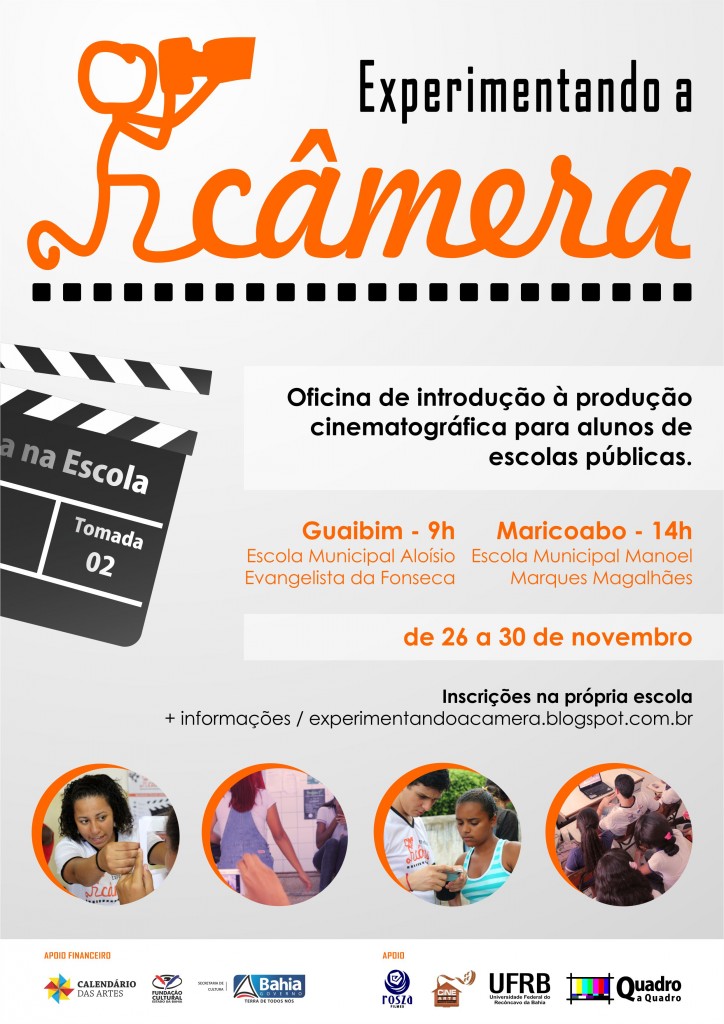 Visando a sensibilizar os jovens para um novo olhar diante da imagem, a 2ª edição do Experimentando a Câmera promove oficinas de introdução à linguagem audiovisual para estudantes do ensino fundamental em dois distritos da cidade de Valença: Maricoabo (Escola Municipal Manoel Marques Magalhães) e Guaibim (Escola Municipal Aloísio Evangelista da Fonseca). As aulas vão acontecer entre os dias 26 e 30 de novembro, em horários opostos das atividades escolares. O projeto foi contemplado pela 2ª Chamada do Calendário das Artes 2012, mecanismo de apoio da Fundação Cultural do Estado da Bahia (FUNCEB), unidade da Secretaria de Cultura do Estado (SecultBA).