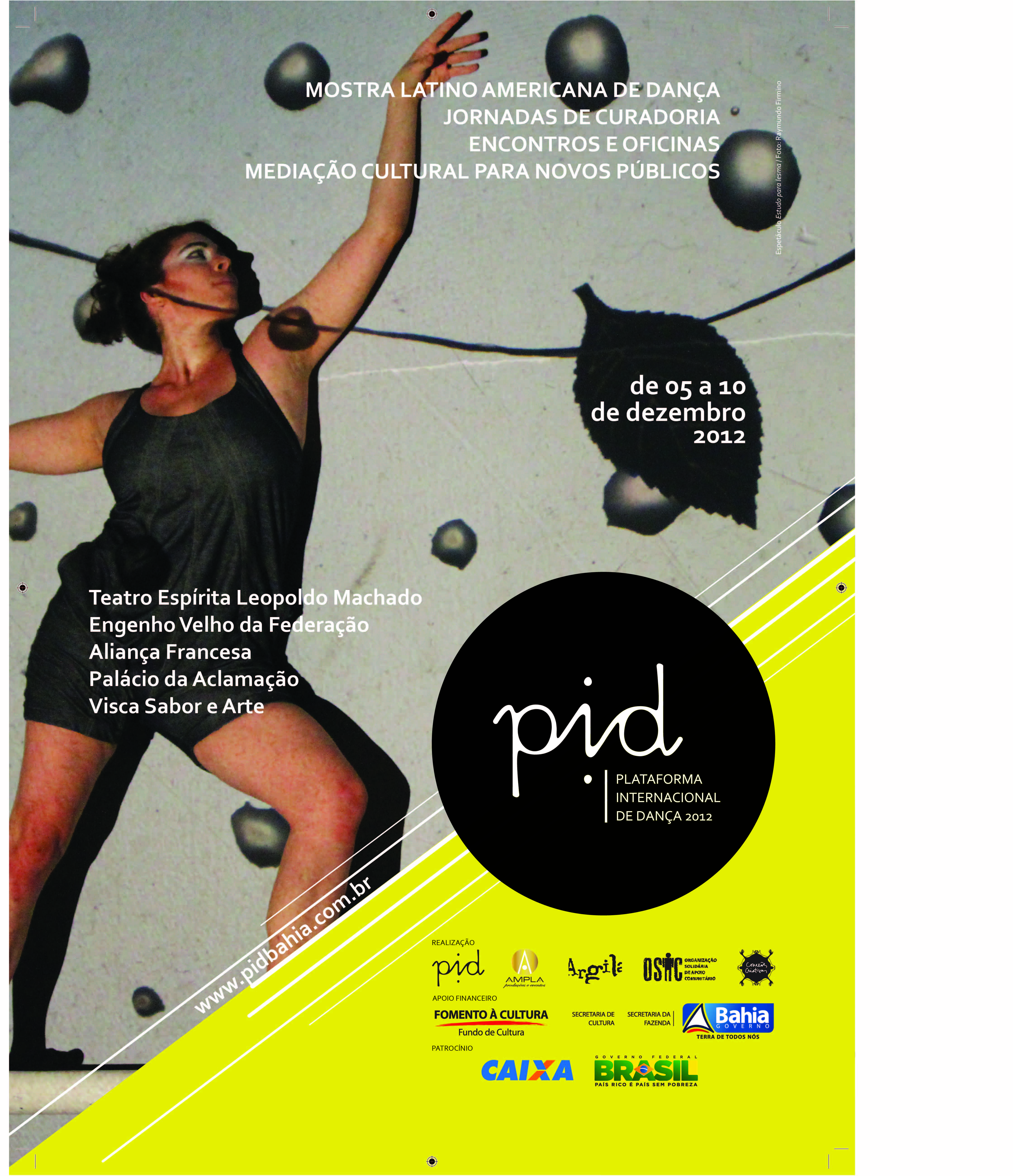 Vínculos sociais, estéticos, políticos entre a dança e as pessoas. Essa é a tônica da PID - Plataforma Internacional de Dança, que chega a sua 4ª edição e realiza a Mostra Latino- Americana de Dança com espetáculos e performances em Salvador, de 05 a 10 de dezembro de 2012. Produções de diversos de países da América Latina e rodas de conversas sobre a dança contemporânea se espalham pela cidade durante o evento, com expectativa de mobilizar a população da cidade para a arte do movimento do corpo. A PID tem apoio da Caixa Cultural e da Secretaria de Cultura do Estado da Bahia através do Fundo de Cultura. Dançarinos e coreógrafos do México, Argentina, Peru, Costa Rica, além dos brasileiros de todos os cantos do país, discutirão através das obras e dos momentos de diálogos o que pode ser uma experiência estética da dança e até onde ela modifica a visão de mundo das pessoas. Para a Mostra Latino-Americana de Dança, o público irá contar com dez espetáculos com 17 apresentações, cinco dias de discussões sobre curadoria e artes e sua relação com os públicos diferentes e de diversos cantos da cidade. Segundo a coordenadora geral da PID, Nirlyn Seijas, o desafio é apresentar as mais diversas formas da arte da dança contemporânea e ampliar o debate sobre a arte. "São poucos os espaços pra gente ver a arte da dança tanto do interior da Bahia quanto dos países da América latina, precisamos de espaço pra ver e conversar sobre o labor da dança e suas possibilidade de ação real na vida cotidiana dos soteropolitanos", ressalta Nirlyn.