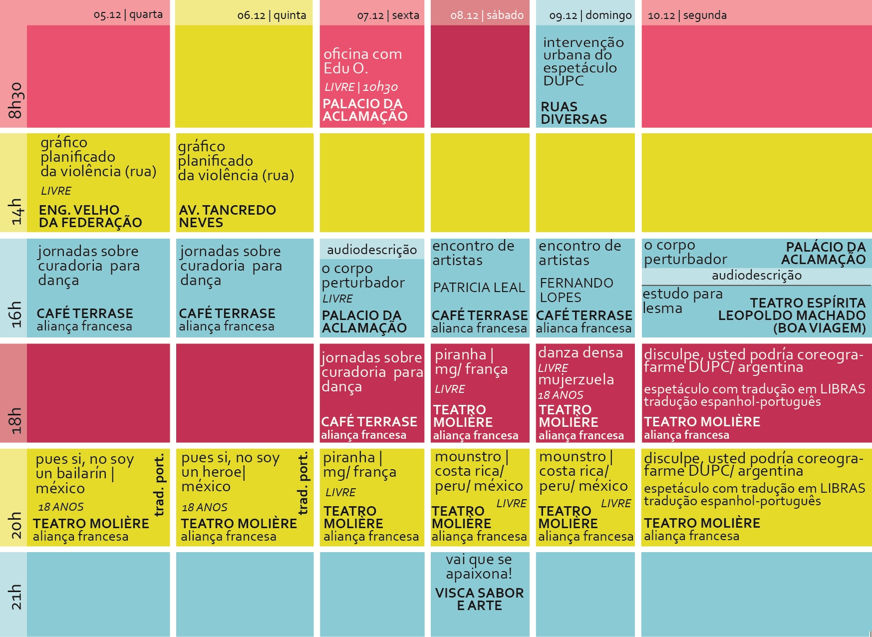 Mediação Cultural - Para encontrar estratégias de aproximar uma plateia pouco habituada aos espetáculos de dança contemporânea, a Plataforma Internacional de Dança - PID mantém por todo ano em funcionamento um grupo de Mediação Cultural, voltado para criar estratégias de aproximação do público das produções de dança contemporânea. Na programação da PID não será diferente. Por meio de parecerias com instituições de ensino e atendimento a pessoas com deficiências. A ideia é fazer mais que levar o público para assistir os espetáculos, mas criar condições para despertar seu interesse e curiosidade em torno da dança contemporânea, dando subsídios para que eles possam fruir e sentir as obras. De acordo com Milena Mariz, coordenadora das ações de mediação cultural, serão desenvolvidas durante a Mostra Latino-Americana de Dança ações como oficinas, rodas de discussão para estimular o público antes de assistir aos trabalhos. O segundo momento é realmente tornar-se plateia e por fim, discutir e avaliar o processo, percebendo como foi a recepção das diferentes etapas. "Com a mediação cultural queremos despertar a curiosidade das pessoas para que elas assistam espetáculos de forma mais aberta, sem a expectativa de que haverá um entendimento total. A intenção é mostrar para elas que a percepção se dá pelo sentimento, pela sensorialidade, de uma forma mais flexível, sem somente pensar se está gostando ou entendendo". Programação - Além da mostra, a PID conta com uma programação bem diversa. Durante o período da apresentação dos espetáculos de toda América Latina, acontece também, dentro da Plataforma, a Jornada sobre Curadoria para Dança. O evento acontecerá nos dias 5 e 6, às 16h e 7, às 18h, no Café Terrasse da Aliança Francesa (Ladeira da Barra). O objetivo dos encontros é promover um diálogo entre artistas e curadores, refletindo sobre os critérios estéticos utilizado pelas curadorias e de que maneira isso impacta a produção artística latino-americana.