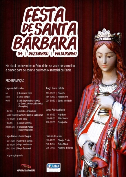 Serviço: FESTA DE SANTA BÁRBARA (04/12) LARGO DO PELOURINHO 5h – Queima de fogos 8h30 – Missa Campa 9h30 – Saída da procissão em direção ao Quartel do Corpo de Bombeiros (Barroquinha) LARGO PEDRO ARCHANJO Atrações: 16h – Anjo Bom 18h30 – Malu Soares 20h – Cortejo Afro LARGO TEREZA BATISTA Atrações: 16h – Caxambu 18h – Nosso Ritmo 20h – Samba Mocidade LARGO QUINCAS BERRO d’ÁGUA Atrações: 16h – Catadinho do Samba 18h – Grupo Movimento 20h – Roque Bentenquê LARGO DO PELOURINHO Atrações: 14h15 – Jorginho Comancheiro 15h30 – Samba 17 Raízes de Santo Amaro 17h – Neto Balla 19h – Aloísio Menezes 20h30 – Orquestra R Xangô/Maestro Reginaldo TERREIRO DE JESUS Atrações: 16h – Claudya Cos’tta 18h – Áudio Mania Todas as atrações serão gratuitas