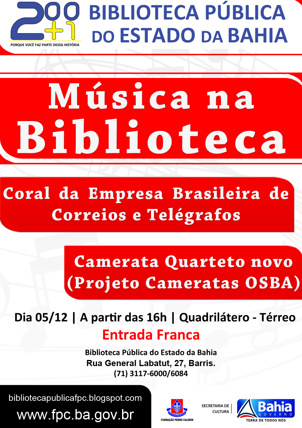 Na próxima quarta-feira (05), a Biblioteca recebe a apresentação do Coral da Empresa Brasileira de Correios e Telégrafos (CORREIOS), cantando peças natalinas e em homenagem aos 100 anos de Luiz Gonzaga. Em seguida, o público assistirá ao grupo Quarteto Novo do projeto Cameratas (OSBA). O evento é gratuito e  acontece no Quadrilátero a partir das 16h. . A camerata Quarteto Novo é composta por dois instrumentos da família das madeiras e dois instrumentos da família das cordas, o grupo é formado por André Becker (flauta transversal), Ilza Cruz (fagote), Djalma Nascimento (violoncelo) e Mario Soares (violino).