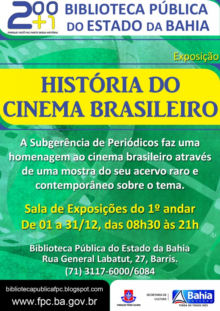 A Subgerência de Periódicos da Biblioteca Pública do Estado da Bahia apresenta, até o dia 31 de dezembro, a exposição “História do Cinema Brasileiro”. A mostra, instalada na Sala de Exposições do 1º andar, pode ser visitada gratuitamente de segunda a sexta-feira, das 08h30 às 21h; aos sábados, das 08h30 às 12h; e aos domingos, das 10h às 16h.