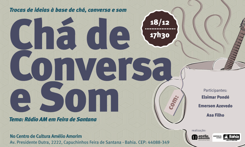O Centro de Cultura Amélio Amorim, espaço cultural da Secretaria de Cultura do Estado da Bahia na cidade de Feira de Santana, realiza no dia 18 de dezembro mais uma edição do Chá de Conversa e Som. O evento, que acontece uma vez por mês, tem por objetivo trazer discussões de temas diversos de interesse público, e através desse bate papo, aproxima artistas, produtores culturais e comunidade.