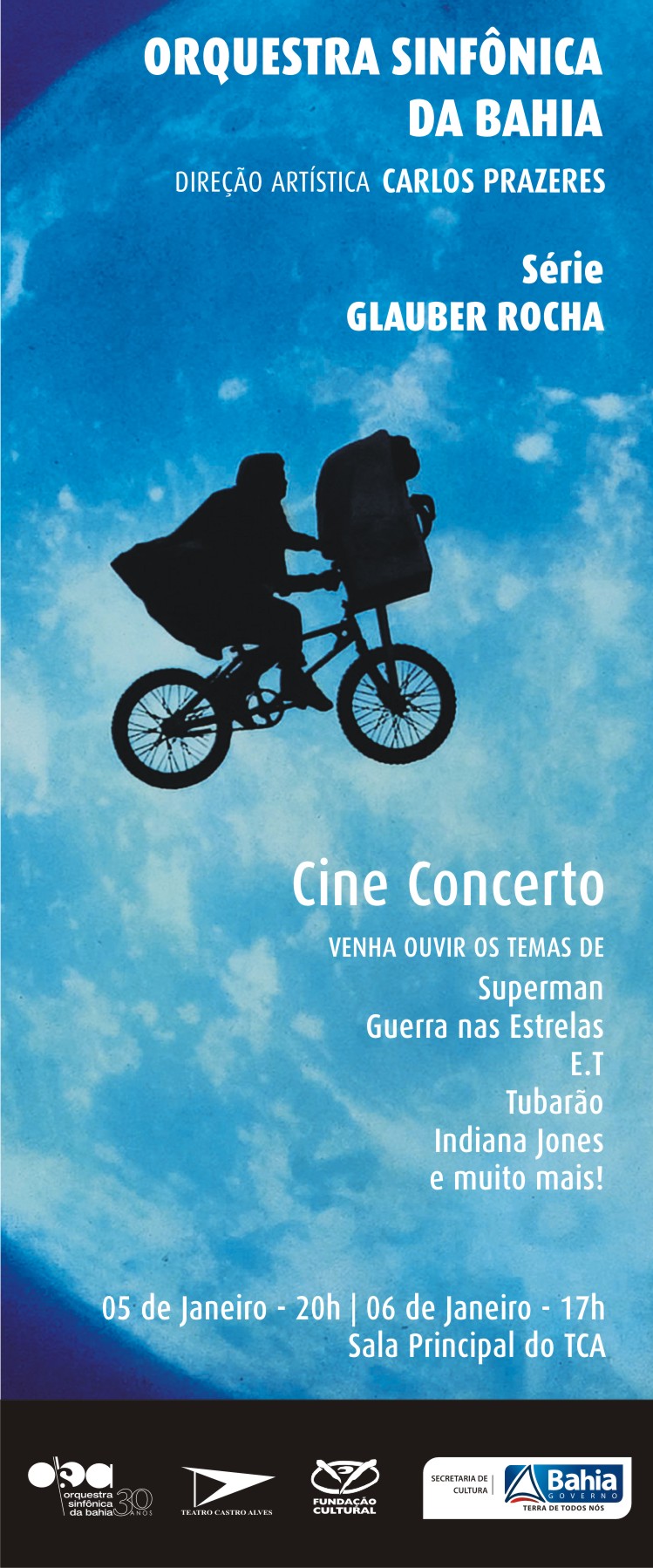 Um programa no ritmo do verão de Salvador – bem quente – foi reservado para baianos e turistas logo no início de janeiro, com a Orquestra Sinfônica da Bahia (OSBA), sob a regência do maestro Carlos Prazeres. É o “Cine Concerto”, espetáculo que vai reunir alguns dos mais famosos temas do cinema em todo o mundo, de sucessos como Superman, Star Wars - Guerra nas Estrelas, E.T. – o Extraterrestre, Indiana Jones e Tubarão, entre outros filmes. Em cartaz nos dia 5 (sábado), às 20 horas, e 6 (domingo), às 17 horas, na Sala Principal do Teatro Castro Alves. Não por acaso, este é o primeiro concerto da Série Glauber Rocha no novo ano, que trará muitas novidades dentro do projeto que leva o nome do genial cineasta baiano. Poderosa aliada da Sétima Arte, a música orquestral - com seus grandes compositores, arranjadores e maestros, a exemplo do americano John Williams (1932) e do britânico John Barry (1933-2011) - é imbatível no universo da produção das trilhas sonoras, proporcionando partituras ricas em beleza, emoções e criatividade, que ficam para sempre na memória do público. Os ingressos para o “Cine Concerto” custam R$ 20,00 (inteira) e R$ 10,00 (meia). A Série Glauber Rocha tem o apoio da Secretaria de Cultura do Estado, Fundação Cultural e Teatro Castro Alves. Serviço: O quê: Orquestra Sinfônica da Bahia (OSBA) – Série Glauber Rocha -“Cine Concerto ” Regente: Maestro Carlos Prazeres Onde: Sala Principal do Teatro Castro Alves Quando: dia 5 (sábado), de janeiro, às 17 horas, e 6 (domingo), de janeiro, às 20 horas.