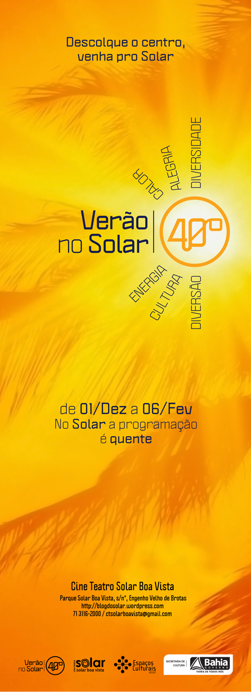No mês mais quente de Salvador, o Cine Teatro Solar Boa Vista – Espaço Cultural da Secretaria de Cultura do Estado da Bahia (Secult BA) - promete aquecer ainda mais a cidade, com a continuação do Solar 40°. O evento, que vem acontecendo desde dezembro de 2012 e teve a abertura com o Solar de Virote, prossegue com programação cultural diversificada em janeiro, a partir do dia 03, com atividades gratuitas ou a preços populares. Diversos espetáculos de teatro e dança fazem parte da programação. Destaques para “Nova Mente”, do grupo teatral Los Catedrásticos, que acontece dia 11 às 20h. No dia seguinte, também às 20h, estará de volta aos palcos do Solar o espetáculo “Soul Transformista”. Todas as quartas, o público poderá conferir também os espetáculos da nova temporada do Verão Cênico, projeto parceiro da Fundação Cultural do Estado da Bahia – Funceb. A música baiana também não ficará de fora do Solar 40°. Cerca de 10 atrações musicais se apresentam no mês, como o grupo Chita Fina, a cantora Zinha Franco lançando o cd “Mosaico”, o ensaio aberto do grupo Skanibais e o II Encontro de Samba Duro Junino. Na área cinematográfica, o Terças na Tela apresenta a Mostra Iconoclássicos, a qual adiciona a linguagem audiovisual à mistura cultural do evento.