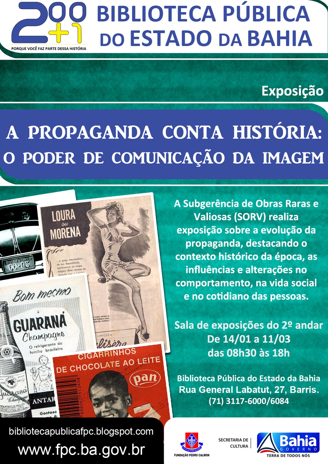 A Subgerência de Obras Raras e Valiosas (SORV) realiza, a partir do dia 14 (segunda-feira), a exposição “A Propaganda Conta História: O Poder de Comunicação da Imagem”. A mostra acontece na Sala de Exposições do 2º andar da Biblioteca Pública dos Barris e pode ser visitada até o dia 11 de março, de segunda a sexta-feira, das 08h30 às 18h, com entrada gratuita. Através da mostra do acervo raro e valioso da Biblioteca, “A Propaganda Conta História” ilustra a evolução da propaganda no Brasil, destacando o contexto histórico da época, bem como sua influência no comportamento, na vida social e no cotidiano das pessoas. Quando: de 14/01 a 11/03, de segunda a sexta-feira, das 08h30 às 18h