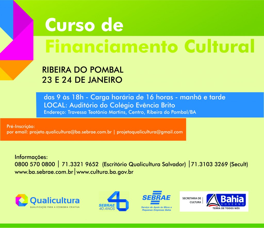 Com o objetivo de fortalecer a qualificação dos agentes culturais e da economia criativa no território Nordeste II semiárido, a Secretaria de Cultura do Estado da Bahia e o SEBRAE, em parceria com a Prefeitura Municipal de Ribeira do Pombal, por meio da Secretaria de Cultura do município, levam à cidade nesta quarta e quinta-feira (23 e 24/01) o curso “Financiamento Cultural”, do Projeto Qualicultura.