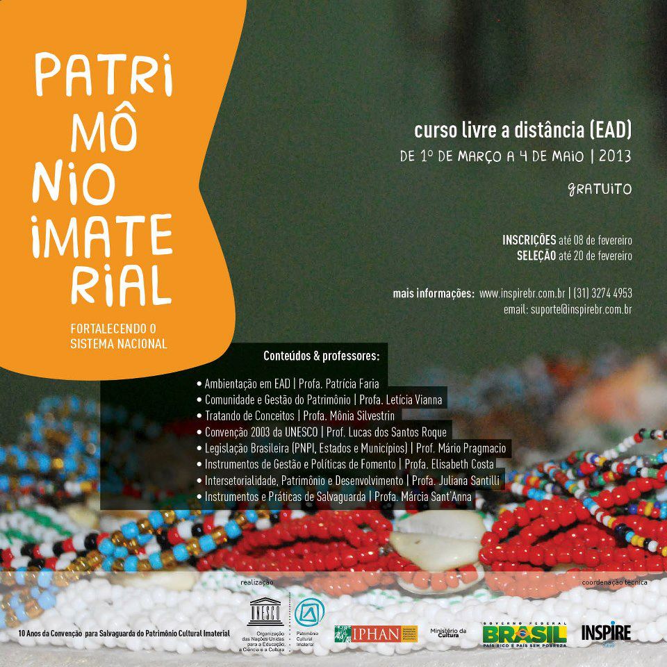 Estão abertas as inscrições, até o dia 8 de fevereiro, para o curso Patrimônio Imaterial: fortalecendo o Sistema Nacional, uma realização do Instituto do Patrimônio Histórico e Artístico Nacional (IPHAN) e da UNESCO no Brasil por meio do Projeto Difusão da Política do Patrimônio Cultural Imaterial no Brasil, e com coordenação técnica da Inspire | Gestão Cultural. Com aulas ministradas a distância, pela internet, o curso acontece entre os dias 1º de março e 4 de maio de 2013. Serão oferecidas 200 vagas para profissionais de todo o Brasil. A iniciativa faz parte das comemorações dos 10 anos da Convenção para a Salvaguarda do Patrimônio Cultural Imaterial, de 2003. Será feita seleção das inscrições enviadas e o resultado será divulgado a partir do dia 20 de fevereiro.