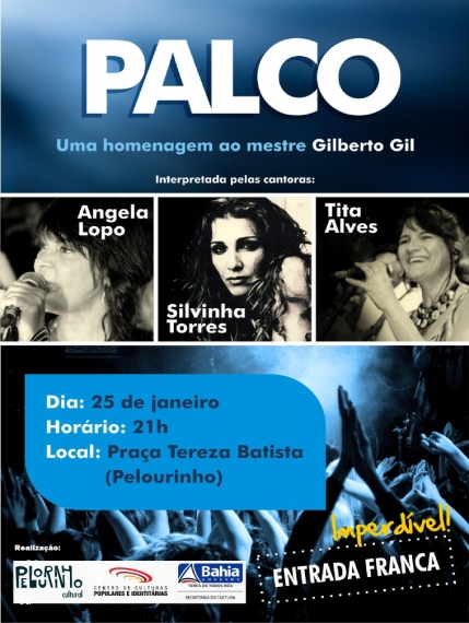 Três belas vozes baianas vão se reunir para celebrar o legado de Gilberto Gil. As cantoras Angela Lopo, Silvinha Torres e Tita Alves estarão juntas no show “Palco. Uma homenagem ao mestre Gilberto Gil” e vão apresentar um repertório que passeia pela obra do cantor e compositor. O show que conta com a direção musical e arranjos do maestro Gerson Silva acontece dia 25/01 (sexta-feira), às 21 horas, noLargo Tereza Batista, com entrada franca. Angela Lopo, Silvinha Torres e Tita Alves dividiram o palco com Gilberto Gil como vocalistas, participando de diversas turnês e da gravação de CDs e DVDs. A ideia de realizar o show “Palco” surgiu da admiração e da experiência de trabalhar com o cantor. O foco da homenagem está nas canções feitas pelo artista, com ou sem parcerias. Composições como “Ladeira da Preguiça”, “Realce”, “Palco”, “Vamos Fugir”, entre outras, estão garantidas no repertório do show que ainda terá a participação de Nara Gil. Serviço Show “Palco. Uma homenagem ao mestre Gilberto Gil” – Angela Lopo, Silvinha Torres e Tita Alves Part. especial: Nara Gil Onde: Largo Tereza Batista Quando: 25/01 (sexta-feira), às 21 horas Quanto: Entrada franca Informações à imprensa: 8816-3929
