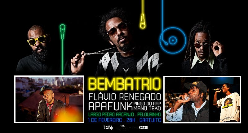 SERVIÇO: Ensaio do trio “Bembatrio em Adrenalina, Melanina e Dendê no Carnaval de Salvador”. Data: dia 01 (sexta) de fevereiro de 2013. Local: Largo Pedro Arcanjo – Pelourinho. Valor: Entrada Franca. Atrações: Bemba Trio, Flávio Renegado, Mano Teko e Pingo do Rap (APAFUNK). Patrocínio: Edital ‘Carnaval Pipoca’, da Secretaria de Cultura do Estado da Bahia (Secult/BA).