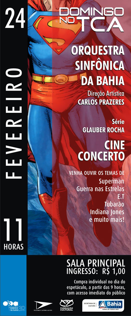 A Orquestra Sinfônica da Bahia (OSBA) volta a apresentar o espetáculo “Cine Concerto”, que lotou as duas sessões do Teatro Castro Alves no início de janeiro, na abertura da Série Glauber Rocha 2013. Desta vez, o “Cine Concerto"é a atração do Domingo no TCA, no dia 24 de fevereiro, às 11 horas, na Sala Principal do Teatro Castro Alves. Os ingressos custam R$ 1,00 (inteira) e serão vendidos no mesmo dia, a partir das 9 horas, com acesso imediato do público. No palco, uma performance inusitada dos músicos da OSBA, sob a regência do maestro Carlos Prazeres, diretor artístico da orquestra, com direito a efeitos e figurinos especiais, e um programa que reúne alguns dos mais envolventes temas do cinema em todo o mundo, de sucessos como Superman, Star Wars - Guerra nas Estrelas, E.T. – o Extraterrestre, Indiana Jones, Tubarão, Harry Porter, Romeu e Julieta, Cinema Paradiso, entre outros filmes. Vale destacar que o “Cine concerto” será apresentado no mesmo dia da cerimônia da entrega do Oscar 2013, em Los Angeles, nos Estados Unidos.