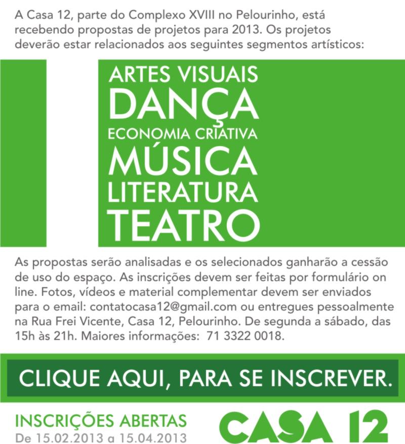 A Casa 12, parte do Complexo do Theatro XVIII no Pelourinho, está recebendo propostas para cessão de uso do espaço a projetos em 2013.