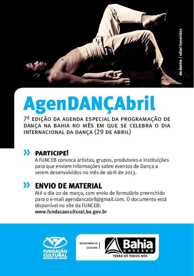 Desde 1982, o Dia Internacional da Dança é celebrado em 29 de abril. Este marco é promovido pelo Conselho Internacional de Dança (CID), uma organização oficial vinculada à UNESCO, fundada em 1973, que congrega as produções de dança através de membros reunidos em todo o mundo: federações, associações, escolas, companhias e indivíduos. Festejar e chamar a atenção para esta data é uma realização importante para aqueles que investem continuamente, o ano inteiro, no fortalecimento, formação, produção, pesquisa, difusão e reconhecimento desta linguagem artística. Tendo em vista este propósito, a Fundação Cultural do Estado da Bahia (FUNCEB), unidade da Secretaria de Cultura do Estado (SecultBA), disponibilizará no mês de abril a 7ª edição da AgenDANÇAbril, uma agenda especial dos espetáculos e eventos de Dança da Bahia que estarão em atividade nas cidades do estado durante o Mês da Dança. A AgenDANÇAbril será formatada em um site, ampliando sua acessibilidade em toda a Bahia. Os conteúdos ali inseridos vão ser sistematicamente reforçados pela FUNCEB através de seus canais de comunicação, servindo de base para ações de divulgação com o público e a imprensa. Para tanto, instituições, grupos, artistas e produtores estão convocados para que enviem as informações sobre atividades a serem desenvolvidas no mês de abril de 2013, tais como apresentações artísticas, temporadas, cursos, palestras ou workshops, na área da Dança. No site da FUNCEB (www.fundacaocultural.ba.gov.br), está disponibilizado um formulário que deve ser preenchido e enviado até o dia 20 de março para o e-mail agendancabril@gmail.com. Envio de conteúdos para a AgenDANÇAbril 2013 Quando: Até 20 de março de 2013 Como: envio do formulário preenchido para o e-mail agendancabril@gmail.com Acesso ao formulário no site da FUNCEB: www.fundacaocultural.ba.gov.br Realização: FUNCEB/ SecultBA