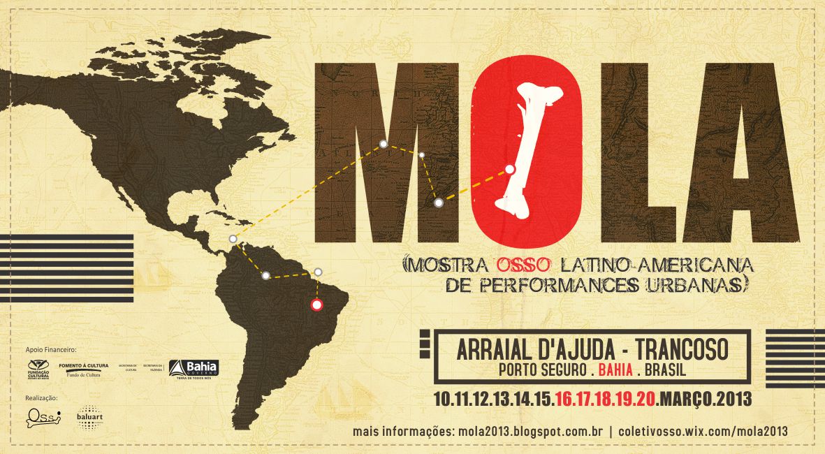 Acontece de 10 a 20 de março a segunda edição da MOLA - Mostra OSSO Latino Americana de Performances – na Costa do Descobrimento. A bordo, performáticos e pesquisadores da linguagem daperformance art de diversos países latino americanos ávidos em (re) descobrir a região tombada pelo IPHAN como patrimônio histórico brasileiro. Elaboradas a partir do contato dos artistas com a realidade local, as performances serão apresentadas em diversos espaços públicos de Arraial D`Ajuda e Trancoso, distritos do município turístico de Porto Seguro. Debates sobre temas relacionados a performance em espaços públicos, a cena independente na América Latina, também estão incluídos na programação da II MOLA, realizada pelo OSSO Coletivo de Performance e viabilizado pelo edital setorial de artes visuais da Fundação Cultural do Estado da Bahia. Fruto de um ciclo de mostras performáticas realizado pelo OSSO em 2009, a MOLA foi criada em 2010 com o objetivo de fortalecer uma rede de performadores na América Latina e ainda inserir a Bahia no calendário dos festivais de performance ao redor do mundo. Levar a linguagem da performance artatualmente bastante restrita aos grandes centros urbanos para outros espaços, permitindo confrontações outras, também são propósitos da MOLA que se configura como uma mostra itinerante de performance e ainda em um fórum privilegiado de trocas de experiências entre artistas e pesquisadores.
