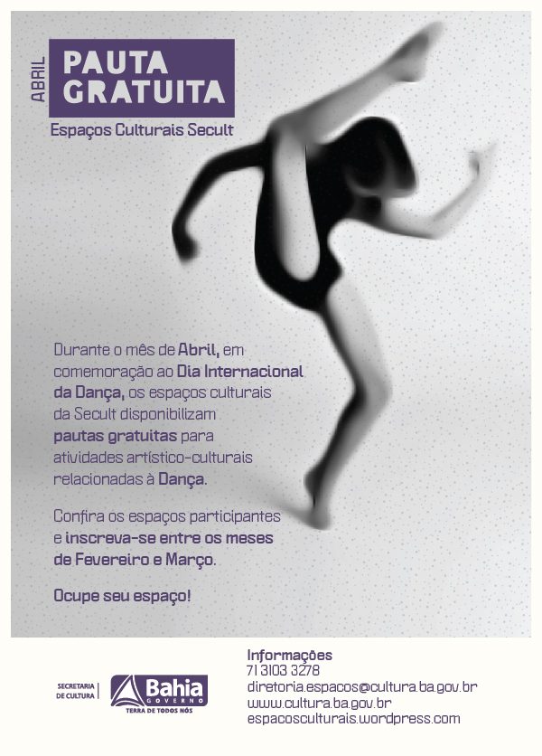 No mês de abril, comemorando o Dia Internacional da Dança (29.04), os Espaços Culturais da Secretaria de Cultura do Estado da Bahia (SecultBA) concedem gratuidade de pauta para qualquer dia da semana, incluindo os sábados e domingos, para atividades artístico culturais relacionadas a Dança. O objetivo é dinamizar a programação dos Espaços Culturais da SecultBA, através da democratização ao acesso às pautas.