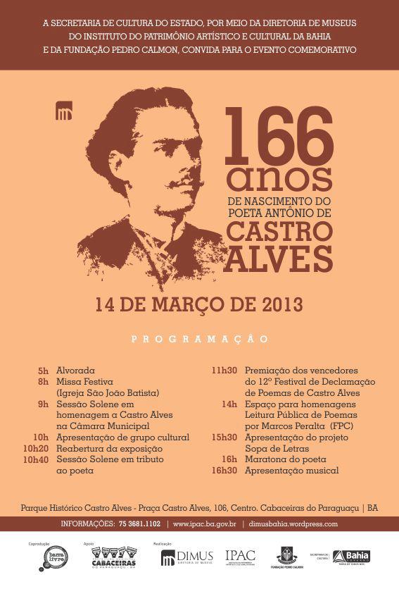 Em 14 de março, Dia da Poesia e aniversário de Castro Alves (14.03.1847 – 06.07.1871), a Diretoria de Museus do Instituto do Patrimônio Artístico e Cultural da Bahia (DIMUS/IPAC) promove uma comemoração festiva para marcar a passagem dos 166 anos de nascimento do trovador baiano. A atividade será realizada no Parque Histórico Castro Alves, unidade vinculada à DIMUS/IPAC situada na fazenda onde nasceu o poeta, em Cabaceiras do Paraguaçu. O evento conta com o apoio da prefeitura do município.