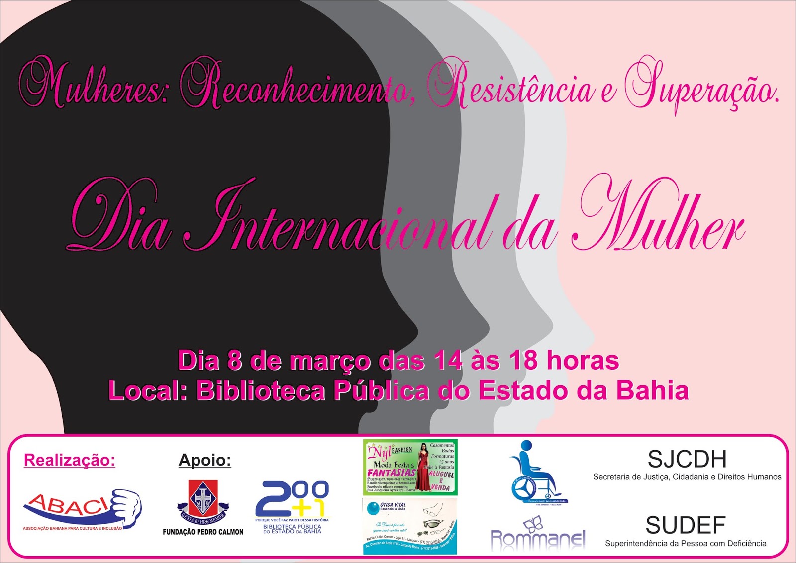 Nesta sexta-feira (08), a Associação Baiana para Cultura e Inclusão (ABACI) realiza, na Biblioteca Pública dos Barris, seminário voltado às mulheres com deficiência em homenagem ao Dia Internacional da Mulher. A atividade acontecerá na Sala Katia Mattoso (3º andar) às 14h.