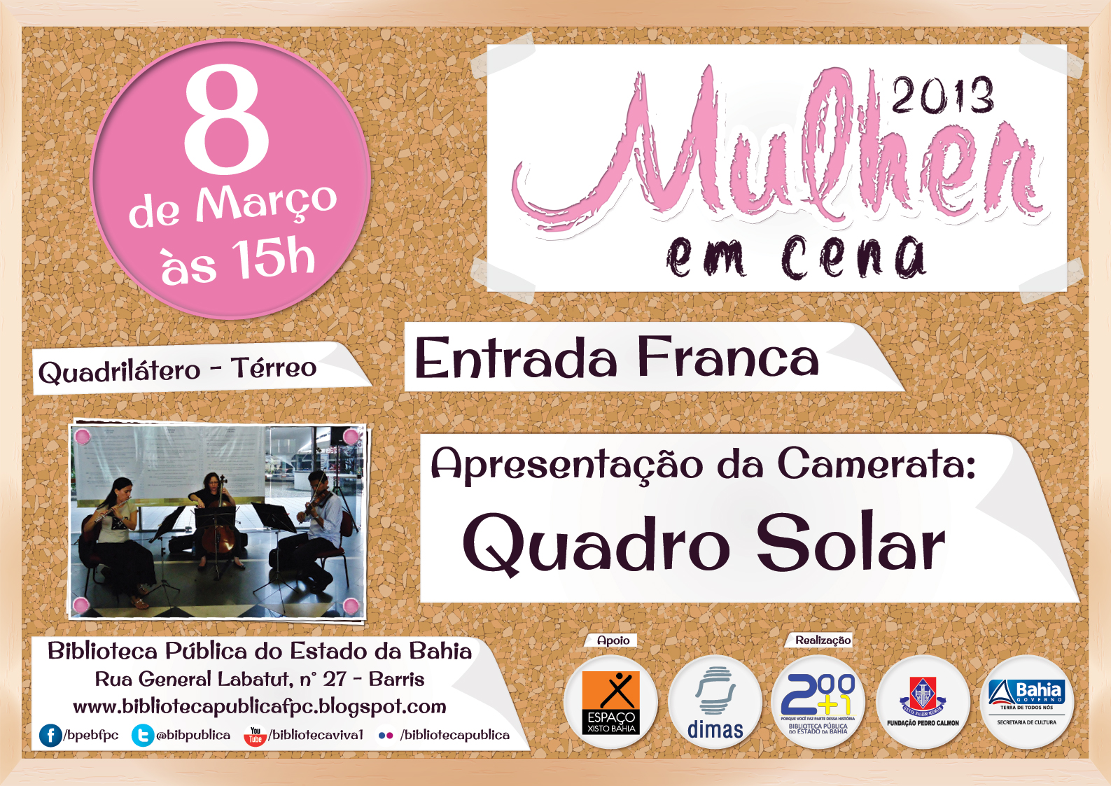 Na próxima sexta-feira (08), em comemoração ao Dia Internacional da Mulher, a Biblioteca Pública dos Barris recebe a apresentação da camerata “Quadro Solar”, em parceria com a Orquestra Sinfônica da Bahia (OSBA). O concerto integra a programação do projeto cultural “Mulher em Cena 2013” e acontecerá às 15h no Quadrilátero da Instituição, com entrada gratuita.