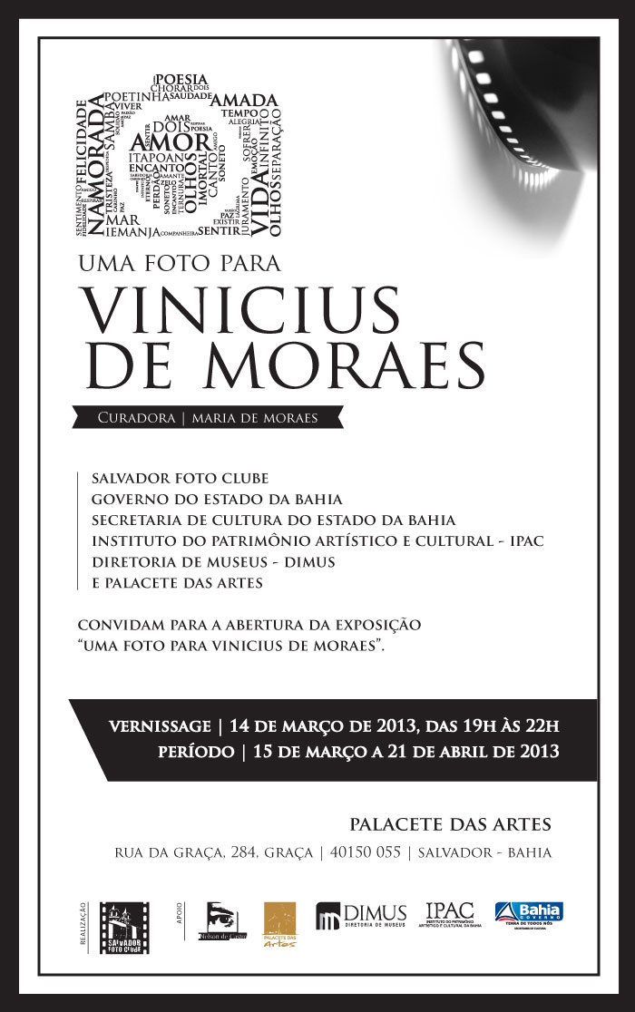 Nessa mostra, organizada pelo Salvador Foto Clube, serão expostas  fotografias, músicas e poemas de Vinícius, com a curadoria da sua filha, Maria de Moraes. A exposição, promovida pelo Palacete das Artes, através da Dimus/IPAC e Secult/Ba, fica aberta a visitação pública até o dia 21 de abril, com entrada gratuita.