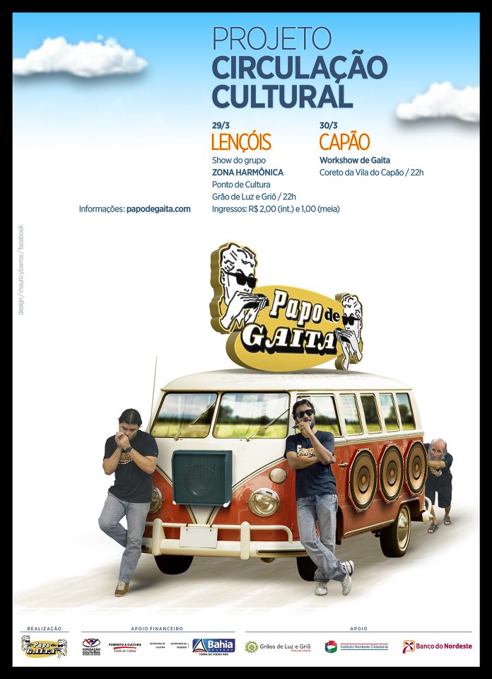 Neste mês de março, o projeto “Papo de Gaita”, idealizado pelo gaitista baiano Luiz Rocha, entra em circulação por três regiões da Bahia. Financiado pela Secretaria de Cultura do Estado da Bahia, o Papo de Gaita promove workshows e apresentações do trio Zona Harmônica, que evidenciam a pluralidade da harmônica de boca e difundem a cultura do instrumento. Nos dias 29 e 30 de março o projeto tem sua primeira edição na Chapada Diamantina. Dia 29/03, sexta-feira, acontece a apresentação do trio de gaitas Zona Harmônica, formado por Luiz Rocha, Breno Pádua e Ramon El-Bachá. O grupo, que ainda contará com Jorge “King Cobra” na bateria, se apresenta no Centro de Cultura do município de Lençóis. No dia seguinte, 30, os músicos realizarão um workshow no Coreto da Vila do Capão. O projeto é voltado não somente para o público que se interessa especificamente pela gaita, mas visa também aproximar o instrumento de públicos mais amplos, difundindo a história do instrumento e destacando gaitistas brasileiros. As apresentações do Zona Harmônica custarão R$2 (inteira). Os dois eventos têm início às 22h. O Papo de Gaita ainda passará por Cachoeira, Valença, Nazaré das Farinhas e terá seu encerramento em Salvador. O projeto é financiado pela Secretaria de Cultura do Estado da Bahia, através da Fundação Cultural do Estado da Bahia (FUNCEB), com recursos do Fundo de Cultura da Bahia (FCBA), pelo Edital Setorial de Música 2012. SERVIÇO Papo de Gaita – circulação cultural