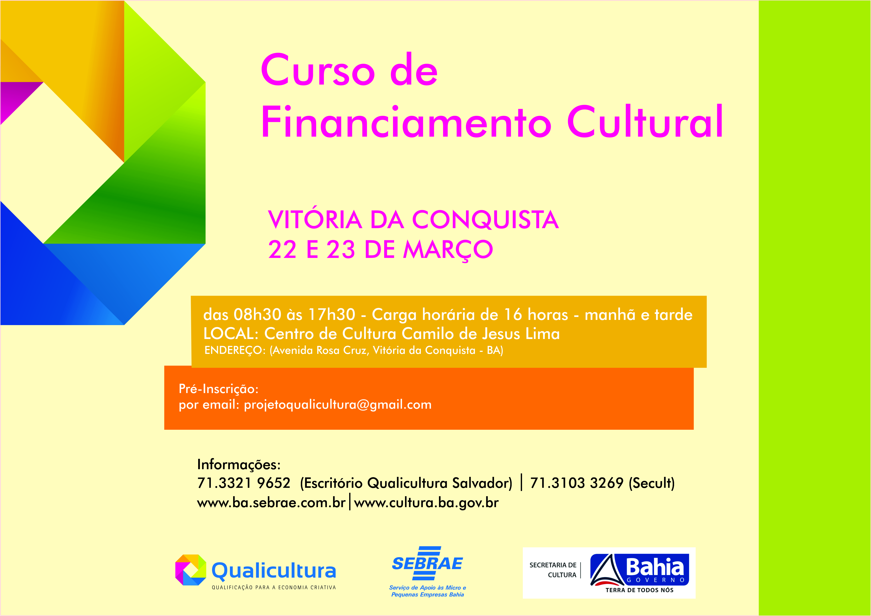 Resultante de uma parceria entre a Secretaria de Cultura do Estado da Bahia (SeculBA) e o SEBRAE, o projeto Qualicultura retoma, dias 22 e 23 de março, suas atividades no município de Vitória da Conquista, com o Curso Financiamento Cultural. Com carga horária de 16h, as aulas serão ministradas pela consultora Rosa Villas Boas e abordarão temas como elaboração de projetos culturais, gestão cultural, financiamento cultural (acesso a mecanismos de fomento), cooperativismo e associativismo. As aulas acontecerão no Centro de Cultura Camilo de Jesus Lima, parceiro na iniciativa.