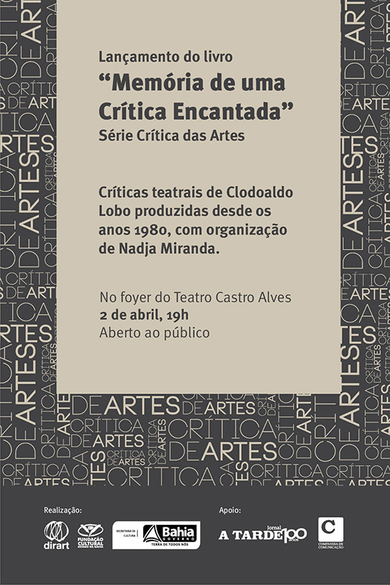 A Fundação Cultural do Estado da Bahia (FUNCEB), entidade vinculada à Secretaria de Cultura do Governo do Estado (SecultBA), lança o livro Memória de uma Crítica Encantada, segundo volume da Série Crítica das Artes, coleção de publicações que objetiva promover a difusão de conteúdos sobre a crítica, mais especificamente aquela relacionada às artes baianas. Esta publicação, organizada por Nadja Miranda, reúne críticas teatrais escritas por Clodoaldo Lobo desde os anos 1980, conteúdo que expressa faces da história recente do Teatro da Bahia. O evento de lançamento, com a presença do secretário de Cultura, Albino Rubim, e da diretora da FUNCEB, Nehle Franke, acontecerá no dia 2 de abril (terça-feira), às 19 horas, no foyer do Teatro Castro Alves, aberto ao público, até a lotação do espaço. Depois da apresentação da versão impressa, a obra estará disponível em arquivo digital no site www.fundacaocultural.ba.gov.br/criticadeartes.