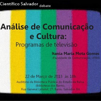 O "Café Científico Salvador", em parceria com a Biblioteca Pública do Estado da Bahia, recebe a professora Itania Maria Mota Gomes, da Faculdade de Comunicação da Universidade Federal da Bahia, para abordar o tema “Análise de Comunicação e Cultura: Programas de televisão”. O evento acontece amanhã (22), às 18h, na Sala Katia Mattoso (3º andar), com entrada gratuita.