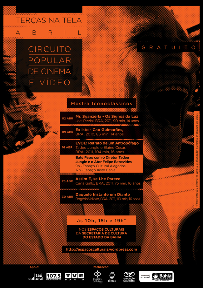 - 16/04 - “EVOÉ! Retrato de um Antropófago”, dos diretores Tadeu Jungle e Elaine Cesar. O documentário apresenta um olhar particular e multifacetado de uma das maiores personalidades das artes do Brasil: o diretor, ator e dramaturgo José Celso Martinez Corrêa. Depoimentos recentes e imagens históricas estão presentes na narrativa, que se baseou em algumas das viagens cruciais para a trajetória de Zé Celso. Após a exibição do filme, Tadeu e o ator Felipe Benevides realizam bate papo com o público. Às 9h, no Espaço Cultural Alagados, e 17h no Espaço Xisto Bahia.