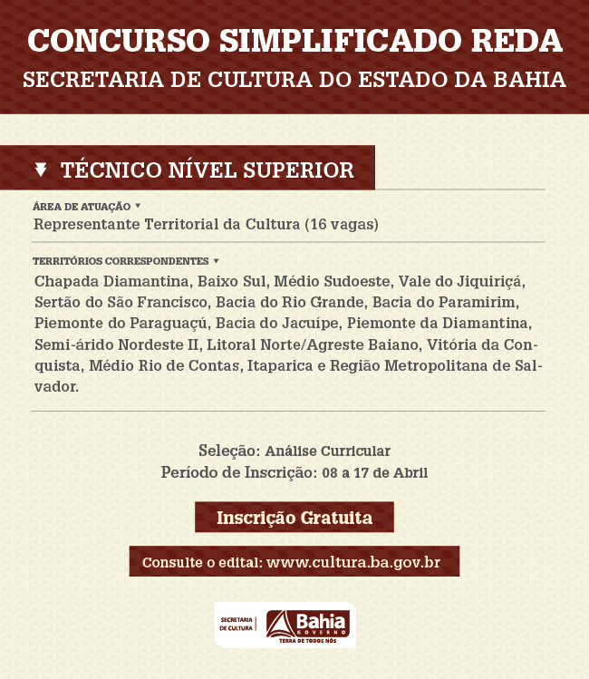 A Secretaria de Cultura do Estado da Bahia (SecultBA) realiza Processo Seletivo Simplificado para contratação de pessoal, por tempo determinado, em Regime Especial de Direito Administrativo – REDA. Os cargos são para função de Técnico de Nível Superior: Representante Territorial da Cultura, com jornada de trabalho de 40 horas semanais (8 horas diárias). As inscrições podem ser feitas de 08 a 17 de abril. Os inscritos devem possuir Nível Superior Completo reconhecido e aprovado pelo MEC. As vagas correspondem a 16 territórios de identidade do Estado: Chapada Diamantina, Baixo Sul, Médio Sudoeste, Vale do Jiquiriçá, Sertão do São Francisco, Bacia do Rio Grande, Bacia do Paramirim, Piemonte do Paraguaçú, Bacia do Jacuípe, Piemonte da Diamantina, Semi-árido Nordeste II, Litoral Norte/Agreste Baiano, Vitória da Conquista, Médio Rio de Contas, Itaparica e Região Metropolitana de Salvador. Cada candidato só pode concorrer a uma localidade no Processo. A remuneração é constituída pelo vencimento básico de R$ 991,80, mais Gratificação de Função no valor de R$ 1.289,34, e auxílio transporte e refeição por dia útil trabalhado. Para se inscrever, os interessados devem clicar aqui, adquirir o Requerimento de Inscrição e a Auto Declaração do Currículo do Candidato. Esses documentos devem ser preenchidos, assinados e encaminhados via Correios, exclusivamente por SEDEX, para o endereço: EDITAL REDA 02/2013 – SECRETARIA DE CULTURA DO ESTADO DA BAHIA – Rua Chile, 22, Caixa Postal 2478, CEP 40.020-970, Salvador – BA. O Processo Seletivo Simplificado será constituído de Análise Curricular, eliminatória e classificatória e, se necessário, realização conjunta de Entrevista como critério de desempate. A Secretaria da Cultura publicará o Resultado Final e Homologação no Diário Oficial do Estado da Bahia e no site www.cultura.ba.gov.br, com a relação dos candidatos habilitados em ordem decrescente de pontuação final por localidade, de acordo com a opção declarada no ato da inscrição. SERVIÇO O quê: Secretaria de Cultura do Estado da Bahia – Processo Seletivo para Representantes Territoriais da Cultura (16 vagas) Quando: De 08 a 17 de abril de 2003 Inscrições: Via correios – exclusivamente SEDEX – para: EDITAL REDA 02/2013 SECRETARIA DE CULTURA DO ESTADO DA BAHIA Rua Chile, 22, Caixa Postal 2478, CEP 40.020-970, Salvador – BA Remuneração: R$ 2.281,14