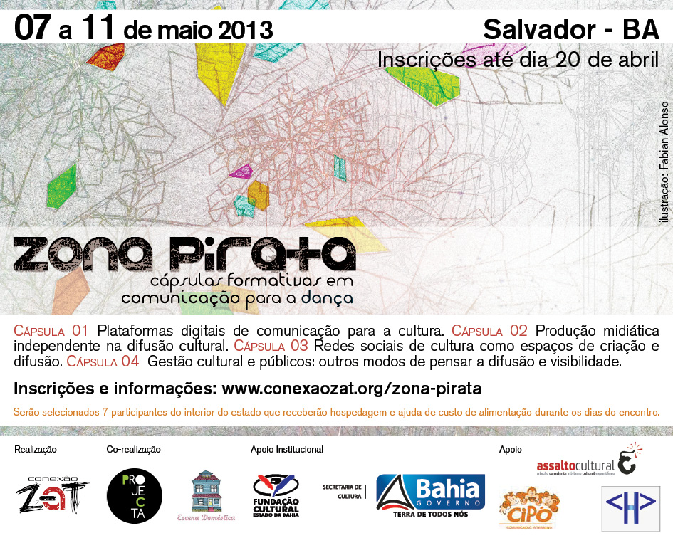 Estão abertas até 20 de abril as inscrições para o Encontro Zona Pirata – Cápsulas Formativas em Comunicação para a Dança, que propõe estabelecer um espaço de formação colaborativo entre agentes da Dança da Bahia e que será realizado entre os dias 7 e 11 de maio no Centro Histórico de Salvador. O projeto é dividido em quatro cápsulas que se relacionam com a troca e compartilhamento de conhecimento em torno do uso de novas tecnologias de informação e comunicação (TICs), dos movimentos de cultura de rede e da democratização da comunicação. As inscrições são gratuitas e reservam uma seleção de sete participantes oriundos do interior do estado para receber auxílio para hospedagem e alimentação na capital. Interessados devem preencher formulário disponível no sitewww.conexaozat.org/zona-pirata. Apoiado através do Prêmio Meses Temáticos do Circo, Dança e Teatro – Diálogos e Reflexões, promovido pela Fundação Cultural do Estado da Bahia (FUNCEB), entidade vinculada à Secretaria de Cultura do Governo do Estado (SecultBA), oEncontro Zona Pirata – Cápsulas Formativas em Comunicação para a Dança é realizado pelo Conexão ZAT, ajuntamento de artistas, produtores e gestores culturais que buscam estratégias para fomentar intervenções artísticas, discussões sobre modos de criação e comunicação, assim como o compartilhamento de informação e conhecimento. Tem correalização da empresa Projecta (SP) e do Festival Escena Doméstica (Chile). A Cipó Comunicação Interativa e a Red de Danza Independiente de Chile são associadas do projeto. Na Cápsula 1 – Plataformas digitais de comunicação para a cultura, as convidadas são Melisa Cañas (De Poéticas Corporales/Argentina), Paula Montecinos (Red Independiente de Chile) e Indira Montoya (Hipermédula.org/Argentina). ACápsula 2 – Produção midiática independente na difusão cultural reúne Florencia Goldsman (Radio RSD/Argentina), Tomás Alonso Fernandéz (Red de Danza Independiente – Projeto Streaming/Chile), Clara Trigo (Sua Dança/BA), Ana Ribeiro (TV Câmara/BA) e Carlos Bonfim (Latitudes Latinas/BA). Já a Cápsula 3 – Redes sociais de cultura como espaços de criação e difusão traz representantes da Rede Fora do Eixo (SP), Escola de Ativismo (SP) e Cipó Comunicação Interativa (BA). Por fim, na Cápsula 4 – Gestão cultural e públicos: outros modos de pensar a difusão e visibilidade, estarão Maria José Cinfuentes (Escena Domestica/Chile), André Fonseca (Projecta/SP) e Fernanda Bevilaqua (Uberlândia/MG). Na abertura (7 de maio, às 18h), além do convidado Bernardo Gutiérrez (Futura Média.net), haverá a mostra de videodança Gran(de) Angular – Cuerpo y Cámara, que trará a Salvador a programação do projeto MovTv, da Red Suramericana de Danza. Sobre o Prêmio Meses Temáticos do Circo, Dança e Teatro – Diálogos e Reflexões – O concurso da Fundação Cultural do Estado da Bahia (FUNCEB), entidade vinculada à Secretaria de Cultura do Governo do Estado (SecultBA), lançado pela primeira vez neste ano de 2013, objetiva apoiar propostas que estimulem o diálogo, a reflexão e a organização em redes em torno do fazer artístico destes setores durante as comemorações do Dia Mundial do Teatro e Dia Nacional do Circo (27 de março), e o Dia Internacional da Dança (29 de abril), efemérides que repercutem em iniciativas de reconhecimento e valorização mundo afora. Com um total de R$ 260 mil em recursos, foram registrados 172 projetos inscritos, dos quais 10 foram selecionados: três de circo, três de dança e quatro de teatro, contribuindo para potencializar a organização de profissionais e o surgimento de projetos inovadores nestas áreas. Encontro Zona Pirata – Cápsulas Formativas em Comunicação para a Dança Inscrições: até 20 de abril pelo site www.conexaozat.org/zona-pirata Quanto: Grátis Abertura: 7 de maio (terça-feira), 18 às 21 horas Cápsulas: 8 a 11 de maio (quarta a sexta, 14 às 17 horas; sábado, 9 às 12 e 14 às 17 horas) Onde: Oi Kabum! (Pelourinho – Centro Histórico de Salvador) Apoio Institucional: FUNCEB/ SecultBA