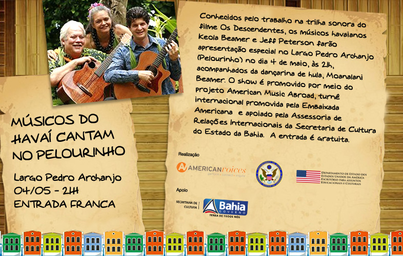 Conhecidos pelo trabalho na trilha sonora do filme "Os Descendentes" - estrelado por George Clooney e vencedor do Oscar 2012 na categoria melhor roteiro adaptado - os músicos havaianos Keola Beamer e Jeff Peterson farão apresentação especial, com entrada gratuita, no Largo Pedro Archanjo, no Pelourinho, dia 4 de maio, às 21h, acompanhados da dançarina de hula, Moanalani Beamer. Antes de desembarcar no Centro Histórico, patrimônio da humanidade, o trio também fará uma apresentação aberta ao público no Teatro ACBEU (Corredor da Vitória), no dia 03, a partir das 20h30. Os artistas se apresentam em Salvador por meio do American Music Abroad (Música Americana no Exterior), programa da Secretaria para Assuntos Educacionais e Culturais do Departamento de Estado dos Estados Unidos. O evento é realizado em parceria com a Assessoria de Relações Internacionais e do Centro de Culturas Populares e Identitárias (CCPI), ambos da Secretaria de Cultura do Estado da Bahia – Secult/BA.