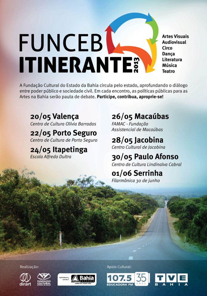 A Fundação Cultural do Estado da Bahia (FUNCEB), entidade vinculada à Secretaria de Cultura do Governo do Estado (SecultBA), realiza a 3ª edição do FUNCEB ITINERANTE. O projeto reúne os dirigentes da FUNCEB para visitar municípios baianos, promovendo encontros com o objetivo de estabelecer contato com realidades distintas do estado para a concepção das políticas públicas para as Artes Visuais, Audiovisual, Circo, Dança, Literatura, Música e Teatro. A viagem, que dura 13 dias em sequência, vai passar por Valença, no território do Baixo Sul (20/5); Porto Seguro, na Costa do Descobrimento (22/5); Itapetinga, no Médio Sudoeste (24/5), Macaúbas, na Bacia do Paramirim (26/5); Jacobina, no Piemonte da Diamantina (28/5); Paulo Afonso, no território de Itaparica BA/PE (30/5); e Serrinha, no Sisal (1º/6). A equipe que integra o FUNCEB ITINERANTE é formada pela diretora geral da FUNCEB, Nehle Franke; o diretor das Artes, Alexandre Molina; o diretor de Audiovisual, Marcondes Dourado; a coordenadora de Artes Visuais, Luciana Vasconcelos; a coordenadora de Circo, Alda Souza; o coordenador de Dança, Matias Santiago; a coordenadora de Literatura, Milena Britto; o coordenador de Música, Cassio Nobre; a coordenadora de Teatro, Maria Marighella; o assessor de Relações Institucionais, Kuka Matos; além de assessores técnicos. Todos eles se farão presentes nos encontros em cada município, que são abertos ao público, e acontecem das 9 às 18 horas, com credenciamento das 8h30 às 9 horas e intervalo de almoço entre meio-dia e 14 horas. Em articulação com representantes territoriais da SecultBA presentes em todo o estado e dirigentes locais, a atividade intenciona atrair às cidades visitadas cidadãos de todo seu entorno: artistas, produtores, gestores, professores, pesquisadores, multiplicadores, estudantes e demais profissionais e pessoas interessadas nas Artes. A realização do projeto conta ainda com apoio das prefeituras municipais das cidades envolvidas e da Diretoria de Espaços Culturais da Superintendência de Desenvolvimento Territorial da Cultura (Sudecult/SecultBA). Além de pautar as linguagens artísticas e as ações realizadas e planejadas pela FUNCEB, os encontros visam a estimular a organização dos setores artísticos, fomentar o debate, ouvir a sociedade em relação às demandas para as linguagens artísticas e promover a articulação com agentes, grupos e instituições culturais do interior da Bahia. Neste sentido, também irá atuar na divulgação da produção artística local, através da cobertura das atividades e do diagnóstico daquilo que se encontrará em cada região. Todos estes registros serão compartilhados no blog do FUNCEB ITINERANTE: www.fundacaocultural.ba.gov.br/funcebitinerante. Histórico do FUNCEB ITINERANTE – Na 1ª edição, entre agosto e setembro de 2011, foram visitadas as cidades de Alagoinhas (Litoral Norte-Agreste Baiano), Senhor do Bonfim (Piemonte Norte do Itapicuru), Itaberaba (Piemonte do Paraguaçu), Barreiras (Oeste Baiano), Vitória da Conquista (Vitória da Conquista) e Ilhéus (Litoral Sul), numa viagem durante 12 dias em sequência, percorrendo cerca de 2,8 mil quilômetros. Na 2ª edição, em junho de 2012, foram mais 12 dias para passar por Teixeira de Freitas (Extremo Sul), Jequié (Médio Rio das Contas), Santa Maria da Vitória (Bacia do Rio Corrente), Seabra (Chapada Diamantina), Euclides da Cunha (Semiárido Nordeste II) e Cruz das Almas (Recôncavo), num total de 3,3 mil quilômetros rodados nas estradas da Bahia. Contabilizando esta lista com as cidades que serão visitadas este ano, já são 19 Territórios de Identidade integrados ao processo. Em 2014, os sete restantes (Bacia do Jacuípe, Irecê, Portal do Sertão, Sertão do São Francisco, Sertão Produtivo, Vale do Jiquiriçá e Velho Chico) vão estar no roteiro do projeto, completando toda a abrangência territorial da Bahia, em seus 27 Territórios, incluindo a presença da sede da FUNCEB no Território da Metropolitana de Salvador. Além do contato direto com cerca de 500 cidadãos nos encontros realizados nos dois primeiros anos do projeto, foram feitas visitas a espaços culturais e locais representativos para a cultura de cada região, bem como conversas com artistas, gestores e gente que faz a produção cultural do interior da Bahia ser rica, diversa, viva, atuante. Em 2012, através de um blog com o diário de bordo, que teve mais de 6 mil visitas, foram feitos os registros das experiências, expondo o compromisso firmado com a sociedade e em busca de contribuir para a divulgação destes múltiplos cenários. A partir disso, o planejamento de ações da FUNCEB pretende dar novos retornos às demandas existentes para o desenvolvimento artístico-cultural do estado. Dentre os reflexos deste processo, está a concepção e lançamento do editalCalendário das Artes, atendendo ao pleito de instituir um mecanismo de apoio com premissas de territorialização da distribuição de recursos. Outro importante resultado do FUNCEB ITINERANTE 2011 pôde ser verificado nas Conferências Setoriais de Cultura de 2011, realizadas em Salvador, que tiveram a presença de participantes dos encontros feitos naquele ano. Com o maior comparecimento de pessoas mobilizadas do interior do estado, a pluralidade nos debates foi ampliada. Já em 2012, o FUNCEB ITINERANTE permitiu a eleição de membros para composição dos Grupos de Articulação Setorial (GAS), que, com representantes de toda a Bahia, deram andamento ao processo de formação dos Colegiados Setoriais das Artes da Bahia, posteriormente instituídos em dezembro de 2012. Assim, a ação contribuiu decisivamente para que se concretizasse este feito inédito na institucionalização da Cultura em nível estadual no Brasil, sendo a Bahia o primeiro estado brasileiro a consolidar seus próprios Colegiados. FUNCEB ITINERANTE 2013 20/05 (segunda-feira): VALENÇA Local: Centro de Cultura Olivia Barrad