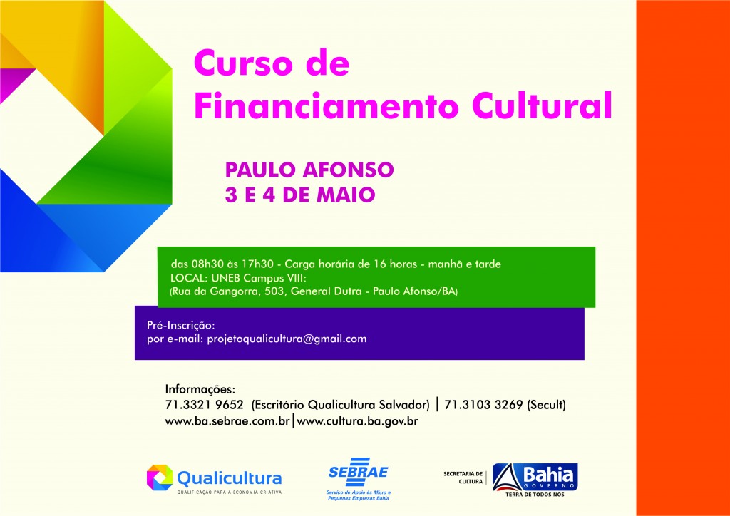 Nos dias 03 e 04 de maio, chega a Paulo Afonso o Curso de Financiamento Cultural do Qualicultura, projeto de parceria entre a SecultBA e o SEBRAE que tem como objetivo estimular o desenvolvimento e o fortalecimento dos setores da economia criativa por meio de cursos e oficinas. Com carga horária de 16 horas, serão emitidos certificados no final do curso, que é gratuito.