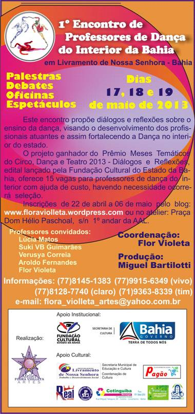 O Atelier Flora Violleta Artes, em Livramento de Nossa Senhora - Bahia, acredita na importância da Linguagem Artística como forma de (re)conhecer (re)criar o mundo. Durante todo o ano mantém cursos nas áreas de Música (violão, baixo, canto e guitarra), Dança (balé e alongamento), Teatro e Artes Plásticas (desenho, pintura e escultura) e oficinas das mais diversas áreas. O GISO - Grupo de Investigação Sonora, Cênica e Plástica e o GRUTA - Grupo de Teatro Amador, nasceram da necessidade de produzir cultura dos seus alunos e professores. É com muita satisfação que vai realizar o 1º Encontro de Professores de Dança do Interior da Bahia entre os dias 17, 18 e 19 de maio, oferecendo hospedagem, alimentação e ajuda de custo para transporte aos participantes e promovendo Palestras, Debates, Oficinas e Apresentações, no sentido de promover o desenvolvimento e estimular reflexões.