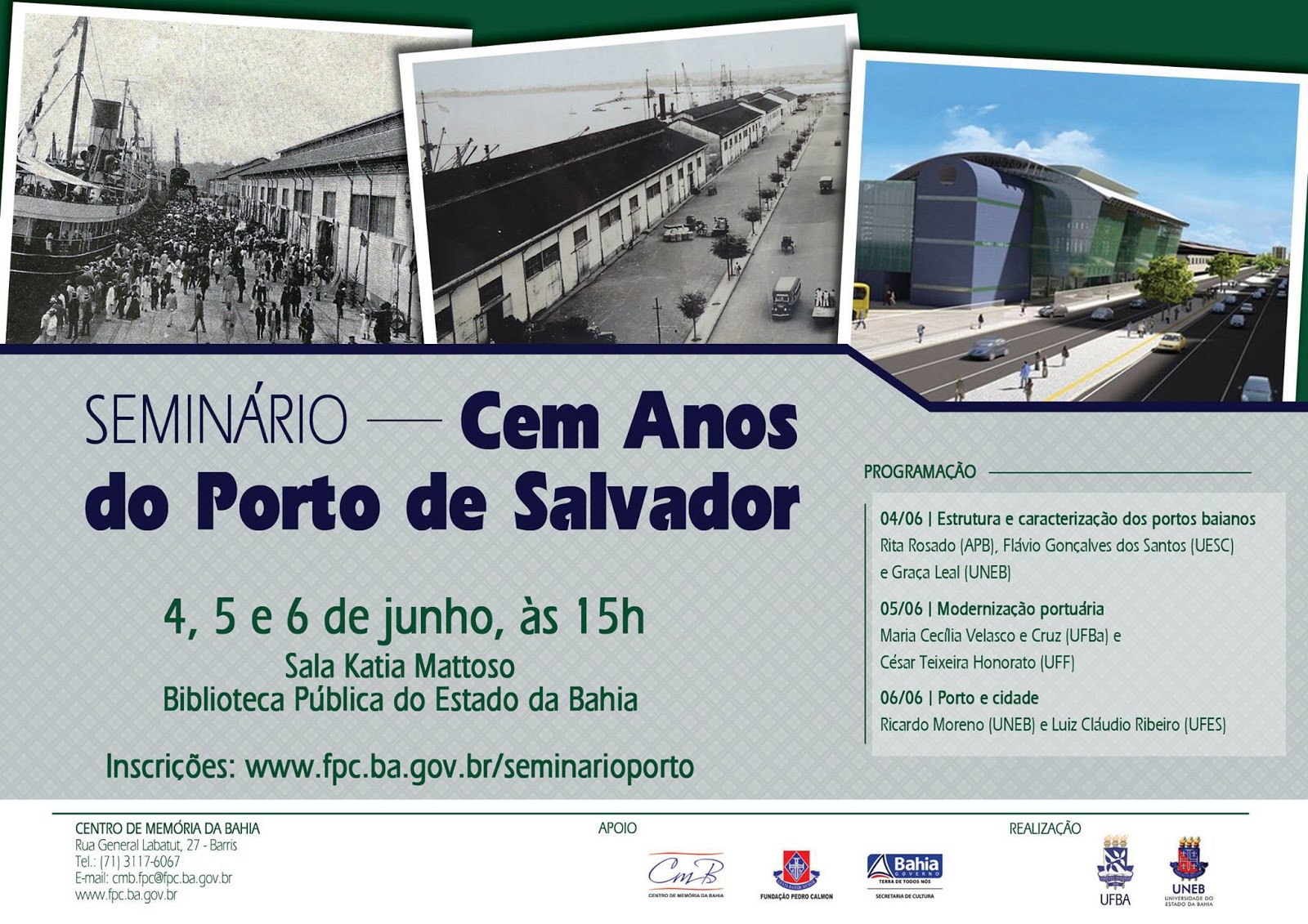 Para comemorar o Centenário do Porto de Salvador, celebrado no dia 13 de maio, o Programa de Pós-graduação em História Regional e Local (PPGHIS) da UNEB e o de Pós-Graduação em História da UFBA, em parceria com o Centro de Memória da Bahia, realizam, entre os dias 04 e 06 de junho, o seminário “Cem Anos do Porto de Salvador”. As aulas têm como principal objetivo trazer para estudantes e historiadores as reflexões e contribuições dos estudos históricos acerca dos portos, bem como, discutir a relação do porto com a formação e evolução da cidade.. Dentre os temas abordados durante o Seminário, estão a estrutura e caracterização dos portos baianos, história e modernização portuária e a relação entre o porto e a cidade.  Os encontros acontecerão sempre às 15h, na Sala Katia Mattoso da Biblioteca Pública do Estado da Bahia. Os interessados deverão se inscrever gratuitamente no site da Fundação Pedro Calmon (http://www.fpc.ba.gov.br/seminarioporto/) ou no local do evento. . PROGRAMAÇÃO 04/06 - Mesa: Estrutura e Caracterização dos Portos BaianosPalestrantes: Rita Rosado (APB) e Flávio Gonçalves dos Santos (UESC), Graça Leal (UNEB) 05/06 - Mesa: História e Modernização PortuáriaPalestrantes: Maria Cecília Velasco (UFBa) e César Teixeira Honorato (UFF) 06/06 - Mesa: Porto e CidadePalestrantes: Ricardo Moreno (UNEB) e Luis Claudio Ribeiro (UFES) SERVIÇO: O que: Seminário “Cem Anos do Porto de Salvador” Quando: Dias 4, 5, e 6 de junho de 2013, sempre as 15h Onde: Sala Katia Mattoso, Biblioteca Pública do Estado da Bahia - Complexo Cultural dos Barris