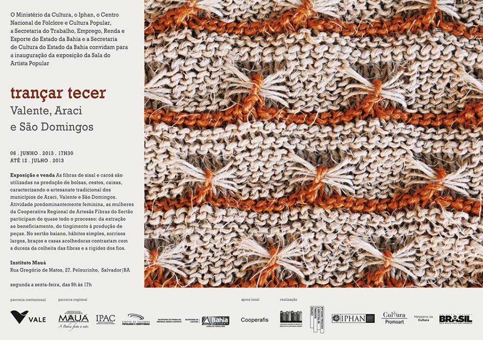 O Centro Nacional de Folclore e Cultura Popular (CNFCP), instituição vinculada ao Instituto do Patrimônico Histórico e Artístico Nacional (IPHAN), órgão do Ministério da Cultura (MinC), realiza, em parceria com o Centro de Culturas Populares e Identitárias (CCPI) e o Instituto do Patrimônio Artístico e Cultural (IPAC), órgãos da Secretaria de Cultura do Estado da Bahia (SecultBa) e o Instituto de Artesanato Visconde de Mauá da Secretaria do Trabalho, Emprego, Renda e Esporte da Bahia (SETRE), a exposição Trançar, tecer: Valente, Araci e São Domingos, a partir do dia 06 de junho (quinta-feira), com abertura às 17h30, na Galeria Mestre Abdias, localizada no Instituto Mauá do Pelourinho. O período de visitação será até 12 de julho de 2013. A mostra apresenta trabalhos feitos com sisal por artesãs de cooperativas de três cidades baianas: Valente, Araci e São Domingos.